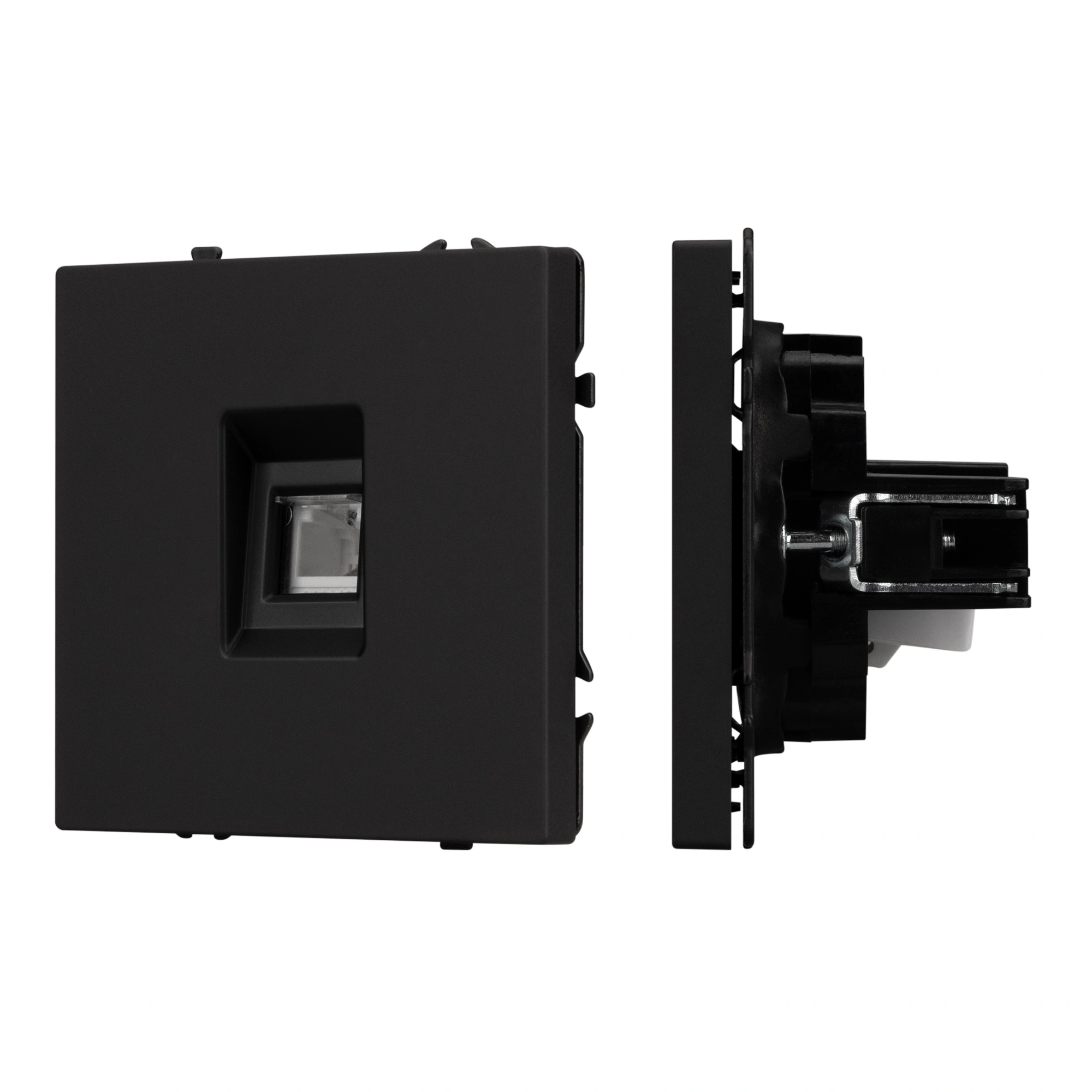 Строгие геометрические линии гармонично сочетаются с функциональностью продуманных механизмов, создавая идеальное решение для дизайн-проектов, где важны как эстетика, так и практичность. Механизм телефонной розетки совместим с рамками серии NOBE, создает утонченный минималистичный вид. Скрытый тип монтажа позволяет гармонично встроить в интерьер любого современного дизайн-проекта. Видимая часть механизма выполнена из высококачественного пластика цвета черный оникс и имеет Soft-Touch покрытие, что придает изделию приятные тактильные ощущения и стильный внешний вид. Выходной порт RJ-11 (Female) формата 6P4C соответствует категории 3 (Cat.3). Самозакрывающаяся крышка защищает выходной порт от повреждения и загрязнения внешних контактов разъема. Контактная часть выполнена по технологии IPC (изоляционно–пробивающего контакта) с нанесением цветной маркировки схемы разводки на корпус, позволяя быстро и легко подсоединить механизм компьютерной розетки к большинству многожильных кабелей типа UTP (неэкранированные). А усиленные распорные лапки двойного захвата надежно фиксируют механизм в установочном подрозетнике круглого сечения диаметром 60мм. Суппорт окрашен в черный матовый цвет под основу механизма и выполнен из металла толщиной 1,5мм, что обеспечивает безопасность и уверенность в установке. На каждой стороне суппорта размещены фиксирующие элементы, позволяющие комбинировать механизмы в системы до 5шт как горизонтально, так и вертикально.