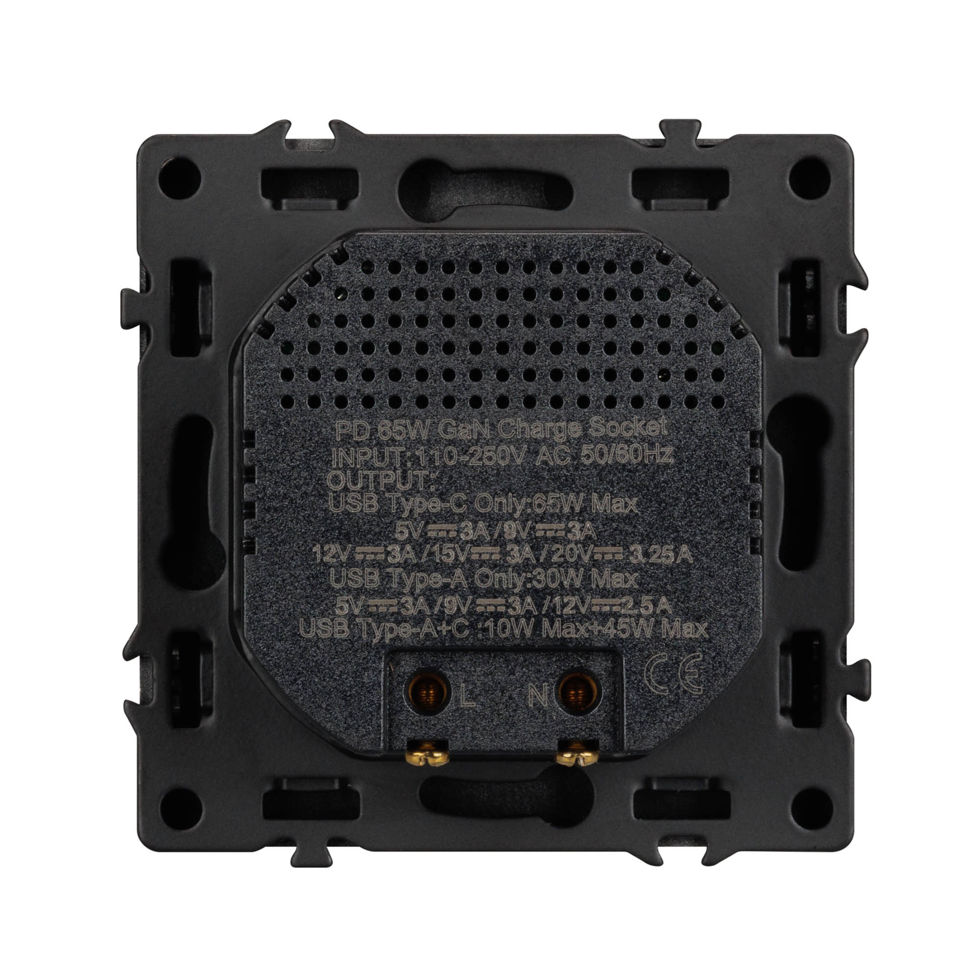 Строгие геометрические линии гармонично сочетаются с функциональностью продуманных механизмов, создавая идеальное решение для дизайн-проектов, где важны как эстетика, так и практичность. Механизм розетки с быстрой USB зарядкой, совместимый с рамками серии NOBE, создает утонченный минималистичный вид. Наличие USB Type A и Type C портов позволяет существенно сократить количество используемых розеточных постов под евровилку, сохраняя единую стилистику интерьера всего современного дизайн-проекта. Оба разъема поддерживают протокол быстрой зарядки Quick Charge QC 3.0, помимо этого для разъема Type C доступен протокол Power Delivery*. Выходные параметры для данных типов портов при этом составляют 30W и 65W соответственно. Видимая часть механизма выполнена из высококачественного пластика серого цвета и имеет Soft-Touch покрытие, что придает изделию приятные тактильные ощущения и стильный внешний вид. Контактная часть присоединяется при помощи винтовых зажимов, позволяя надежно подсоединить механизм выключателя к питающим элементам. Суппорт окрашен в черный матовый цвет под основу механизма и выполнен из металла толщиной 1,5мм, что обеспечивает безопасность и уверенность в установке. На каждой стороне суппорта размещены фиксирующие элементы, позволяющие комбинировать механизмы в системы до 5шт как горизонтально, так и вертикально. *Для активации функции быстрой зарядки необходимо использовать специализированный зарядный кабель, который предназначен для работы с зарядными устройствами повышенной мощности.