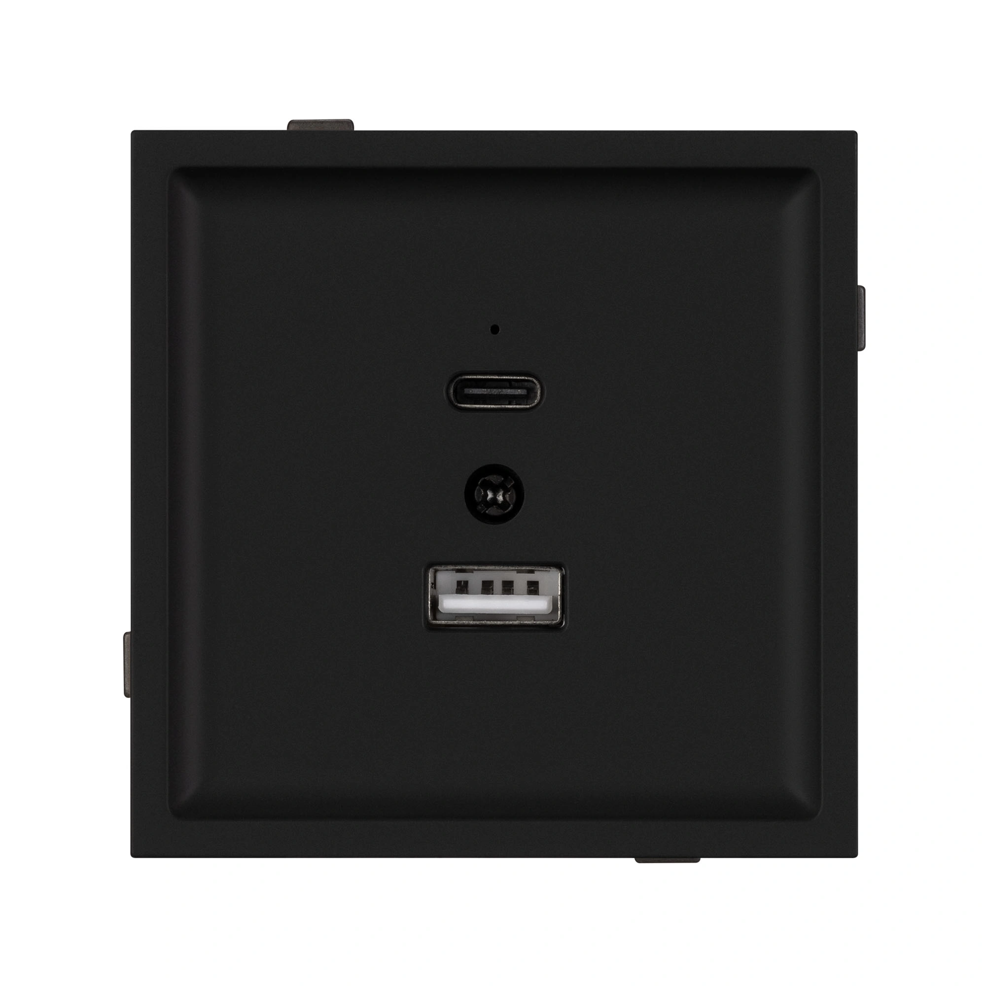 Механизм розетки с быстрой USB зарядкой, совместимый с рамками серии TENDO, создает утонченный минималистичный вид. Наличие USB Type A и Type C портов позволяет существенно сократить количество используемых розеточных постов, сохраняя единую стилистику интерьера современного дизайн-проекта. Оба разъема поддерживают протокол быстрой зарядки Quick Charge QC 3.0, помимо этого для разъема Type C доступен протокол Power Delivery*. Выходные параметры для данных типов портов при этом составляют 20W. Видимая часть механизма выполнена из высококачественного пластика черного цвета и имеет Soft-Touch покрытие, что придает изделию приятные тактильные ощущения и стильный внешний вид. Контактная часть присоединяется при помощи винтовых зажимов, позволяя надежно подсоединить механизм выключателя к питающим элементам. Суппорт окрашен порошковой краской и выполнен из металла толщиной 1,5мм, что обеспечивает безопасность и уверенность в установке. На каждой стороне суппорта размещены фиксирующие элементы, позволяющие комбинировать механизмы в системы до 5шт как горизонтально, так и вертикально. *Для активации функции быстрой зарядки необходимо использовать специализированный зарядный кабель, который предназначен для работы с зарядными устройствами повышенной мощности.