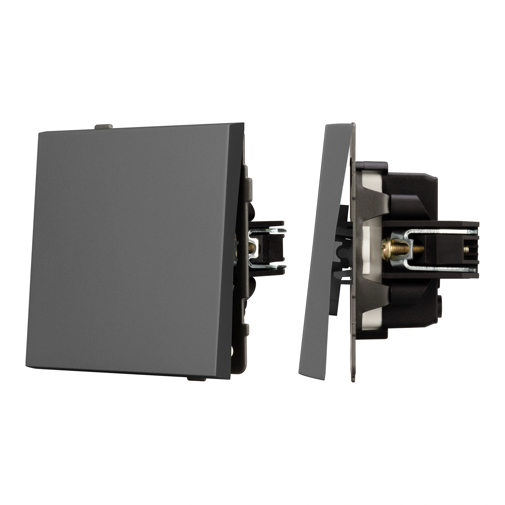 Механизм выключателя света клавишный на 1 пост 1 клавиша (непроходной). Цвет - серый, с Soft-Touch покрытием. Без фронтальной рамки. Уровень пылевлагозащиты IP20. Выключатель устанавливается в стандартный подрозетник круглого сечения диаметром 60мм.