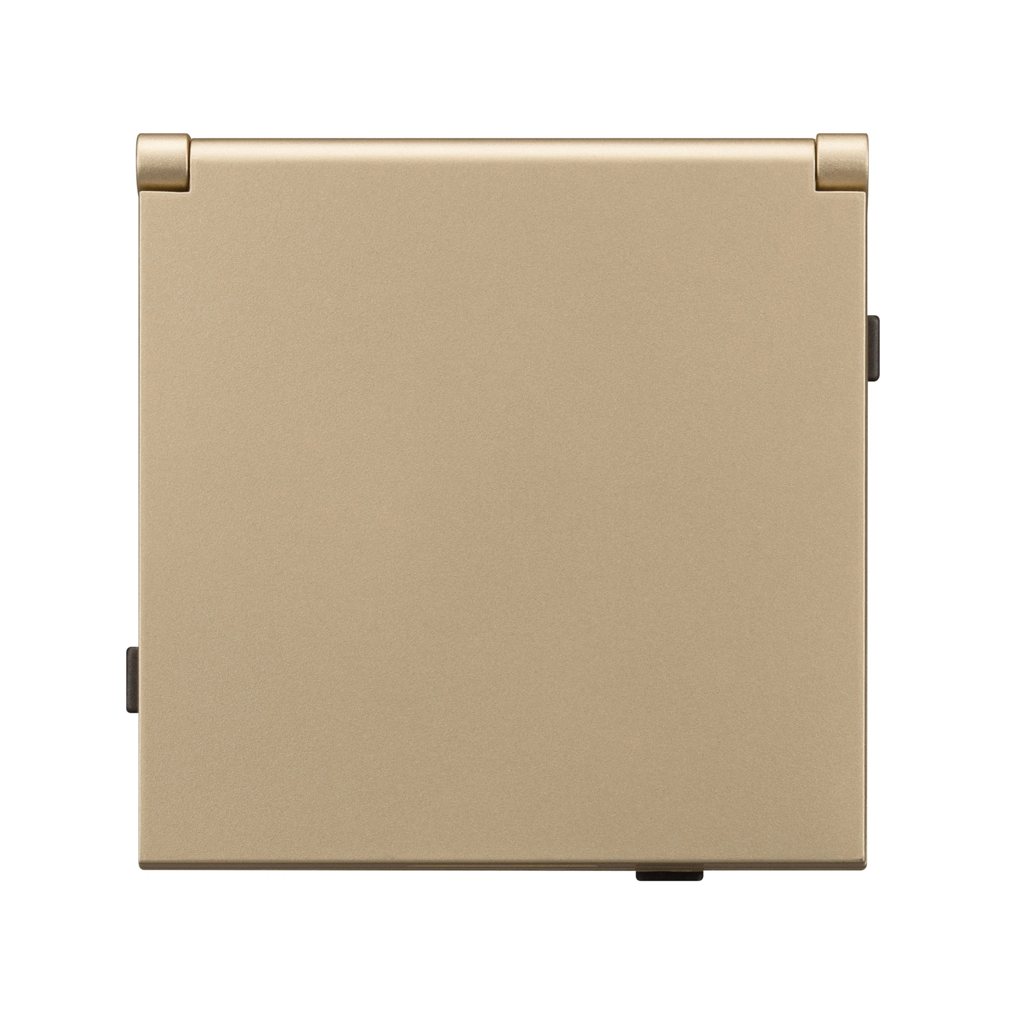 Механизм розетки с заземлением и влагозащитной крышкой на 1 пост. Цвет - золотой, с Soft-Touch покрытием. Без фронтальной рамки. Уровень пылевлагозащиты IP44. Розетка устанавливается в стандартный подрозетник круглого сечения диаметром 60мм.