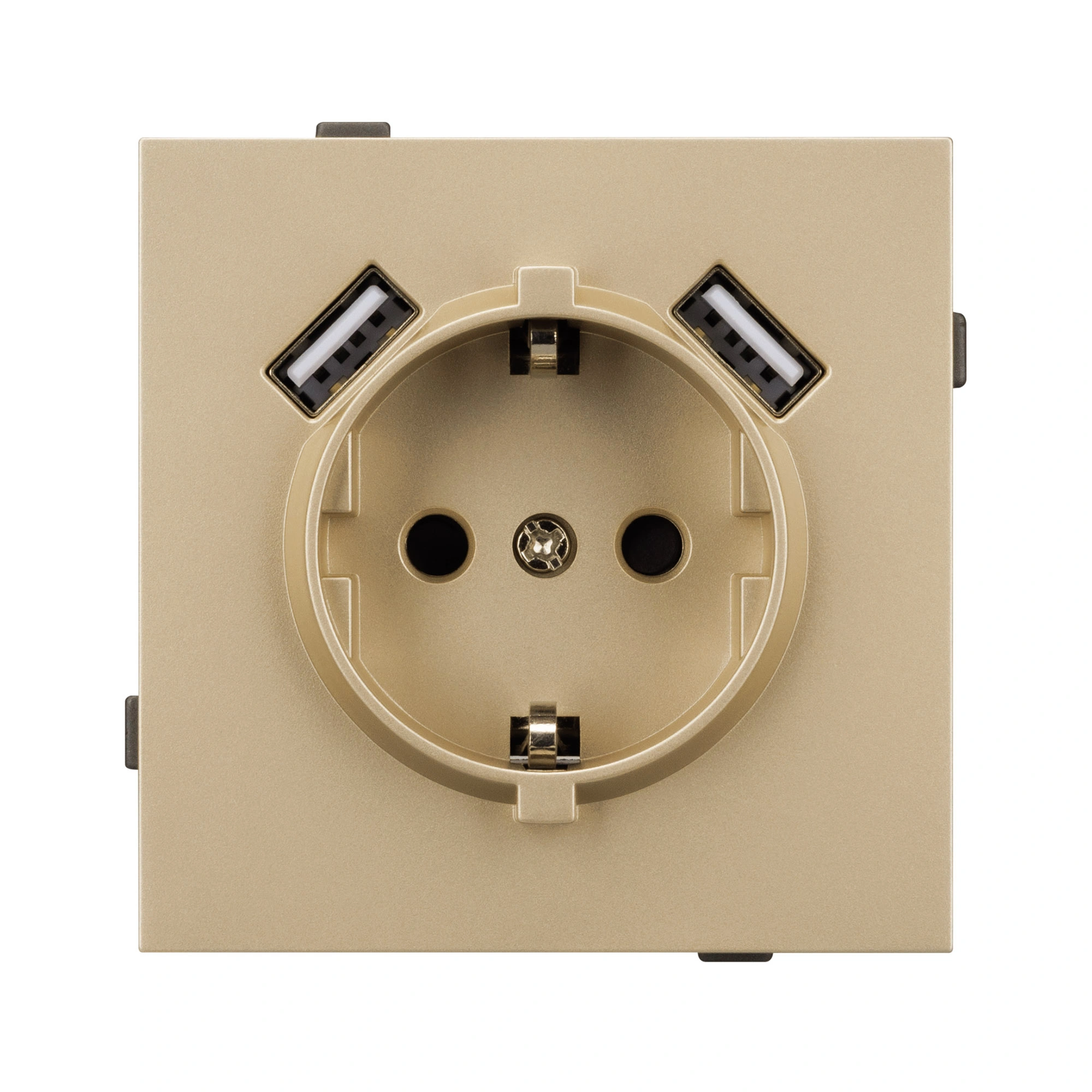 Механизм розетки с заземлением на 1 пост и 2USB Type A порта. Цвет - золотой, с Soft-Touch покрытием. Без фронтальной рамки. Уровень пылевлагозащиты IP20. Розетка устанавливается в стандартный подрозетник круглого сечения диаметром 60мм.