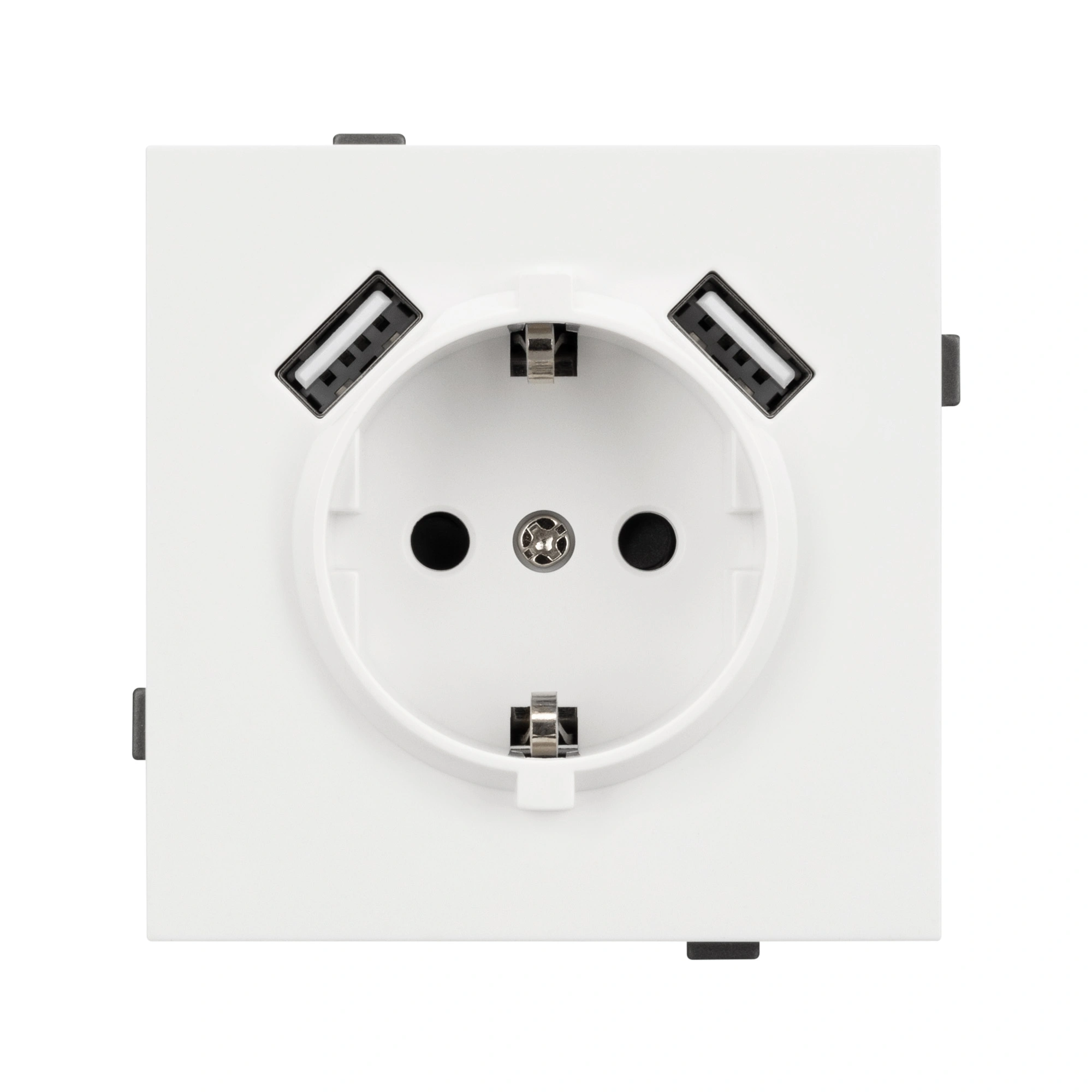 Механизм розетки с заземлением на 1 пост и 2USB Type A порта. Цвет - белый, с Soft-Touch покрытием. Без фронтальной рамки. Уровень пылевлагозащиты IP20. Розетка устанавливается в стандартный подрозетник круглого сечения диаметром 60мм.