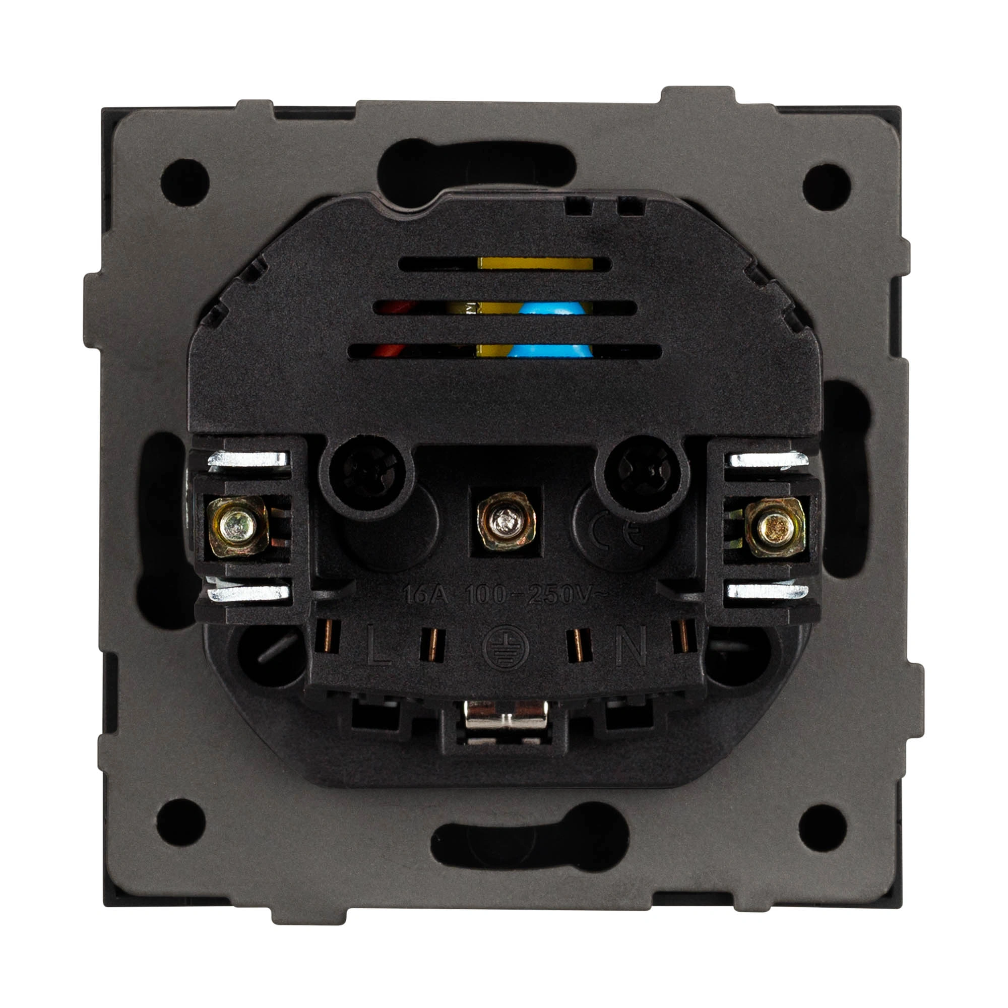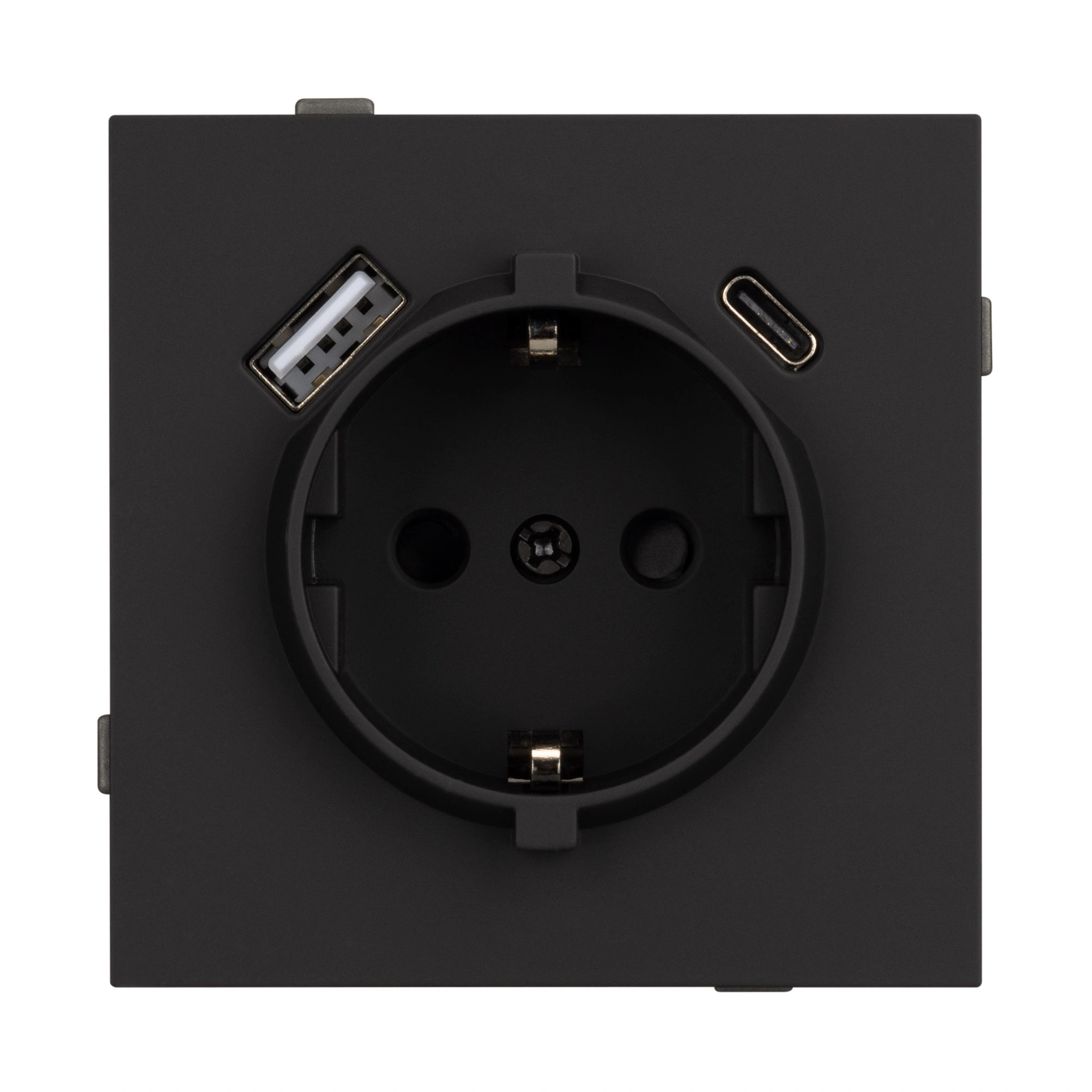 Механизм розетки с заземлением 1 пост 2 USB Type A+C порта. Цвет - черный, с Soft-Touch покрытием. Без фронтальной рамки. Уровень пылевлагозащиты IP20. Розетка устанавливается в стандартный подрозетник круглого сечения диаметром 60мм.