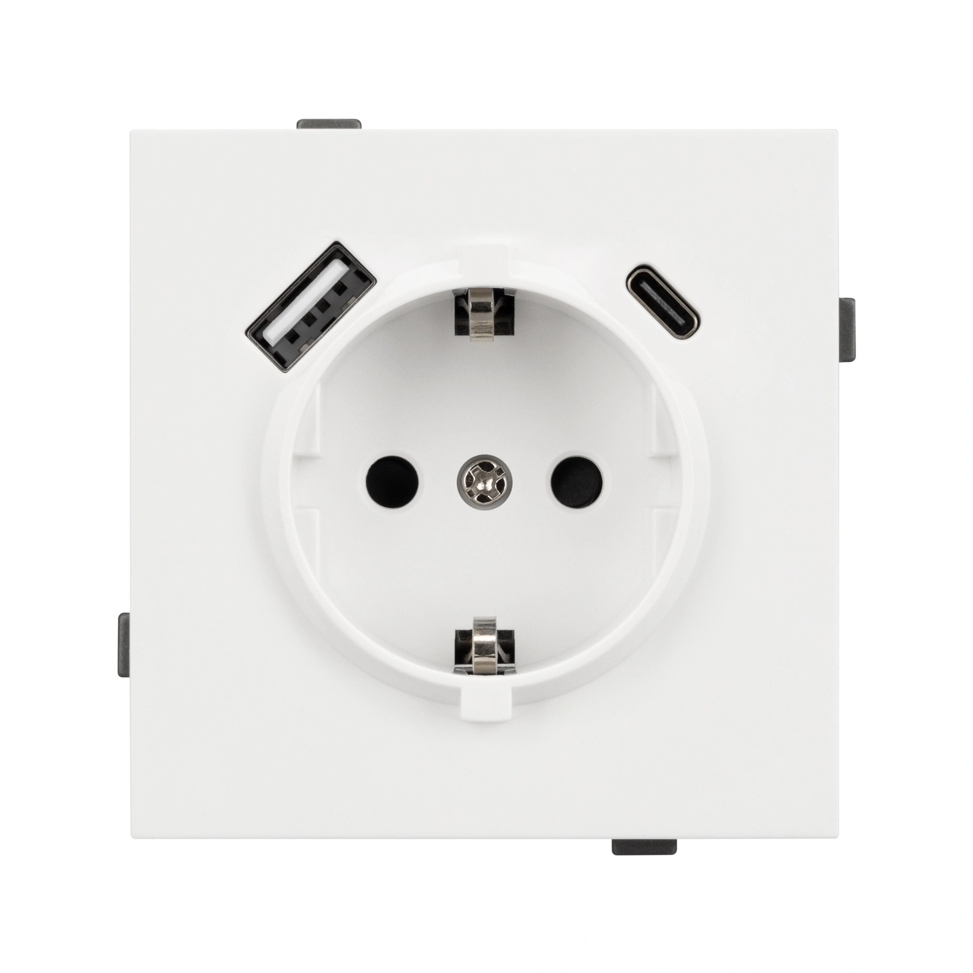 Механизм розетки с заземлением 1 пост 2 USB Type A+C порта. Цвет - белый, с Soft-Touch покрытием. Без фронтальной рамки. Уровень пылевлагозащиты IP20. Розетка устанавливается в стандартный подрозетник круглого сечения диаметром 60мм.
