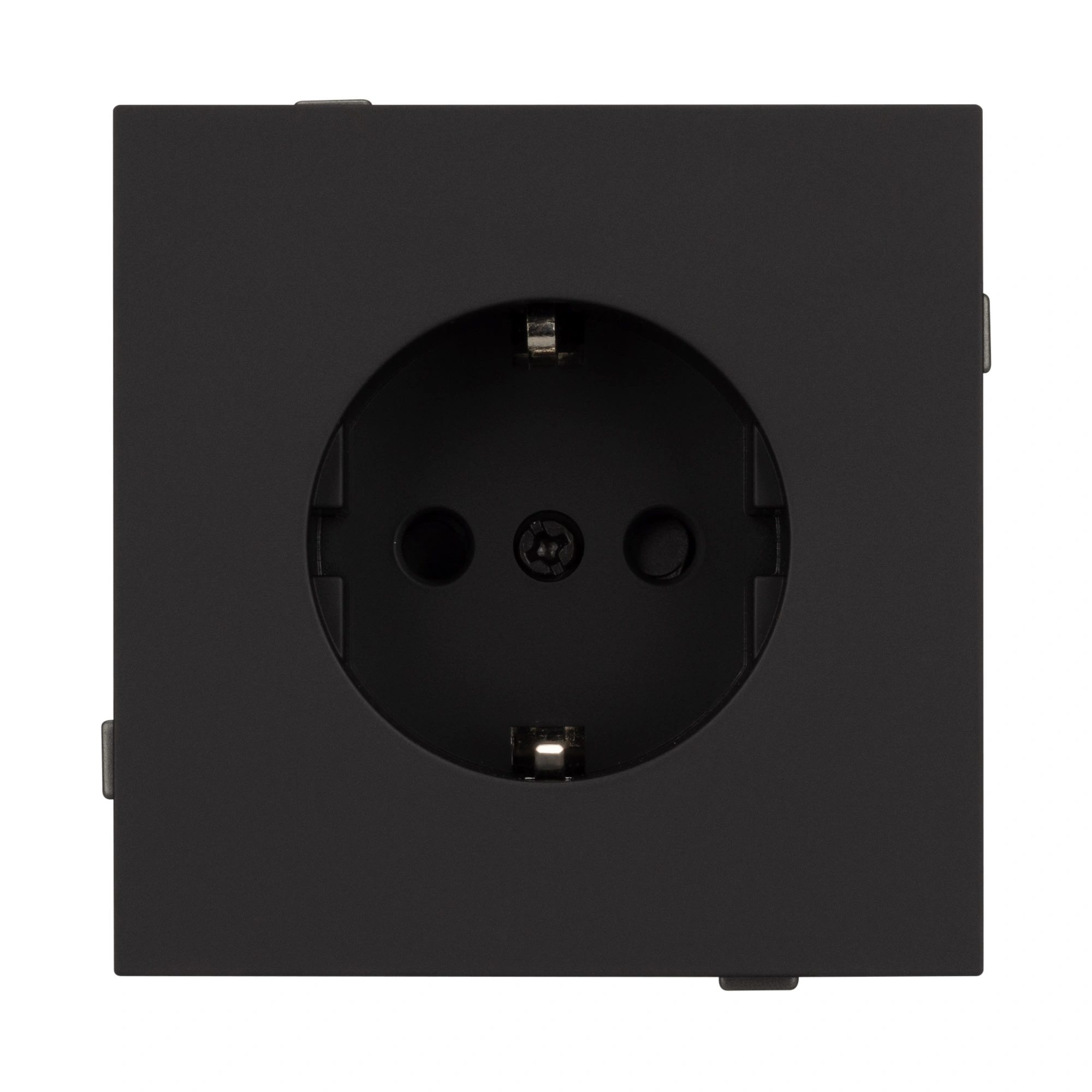 Механизм розетки с заземлением на 1 пост. Цвет - черный, с Soft-Touch покрытием. Без фронтальной рамки. Уровень пылевлагозащиты IP20. Розетка устанавливается в стандартный подрозетник круглого сечения диаметром 60мм.