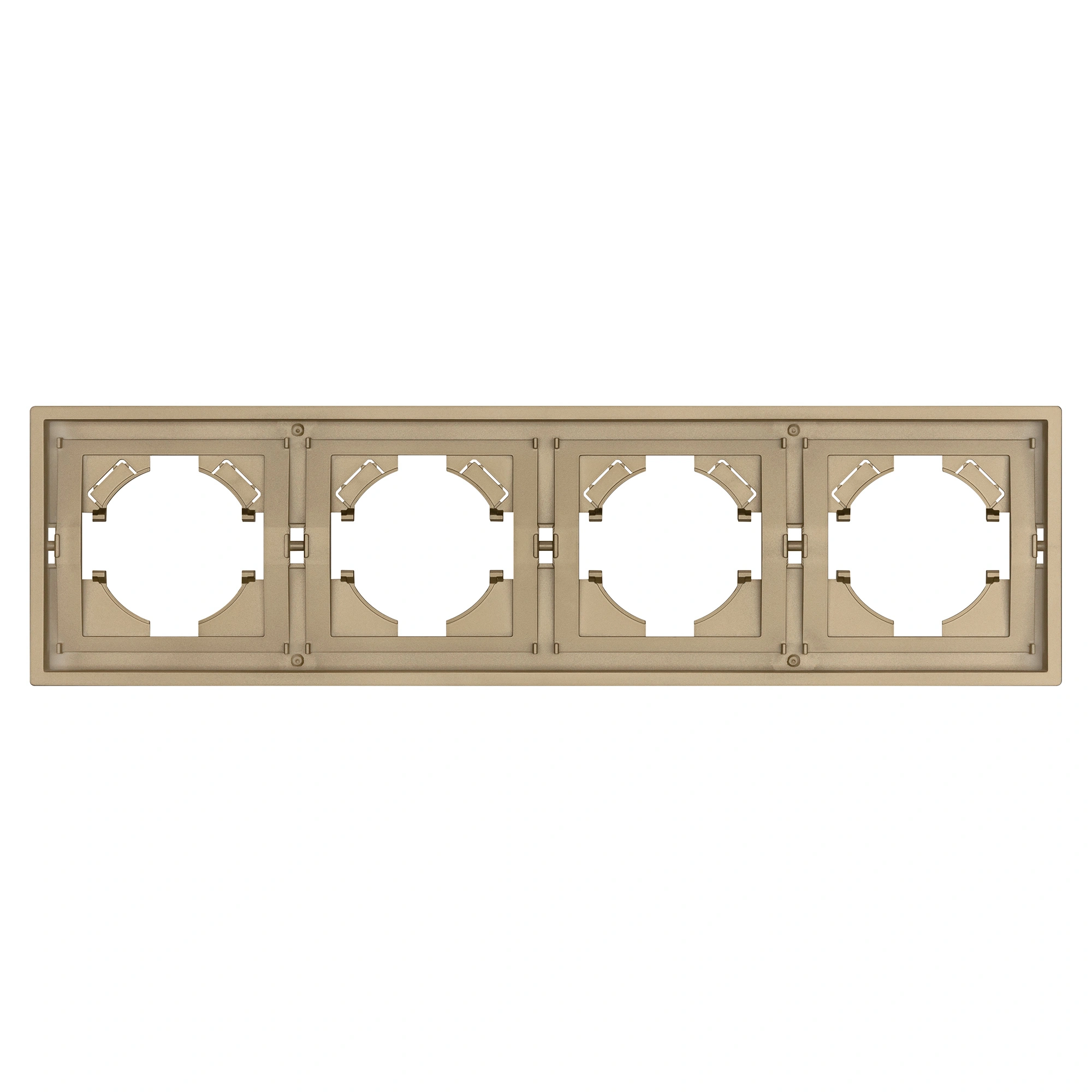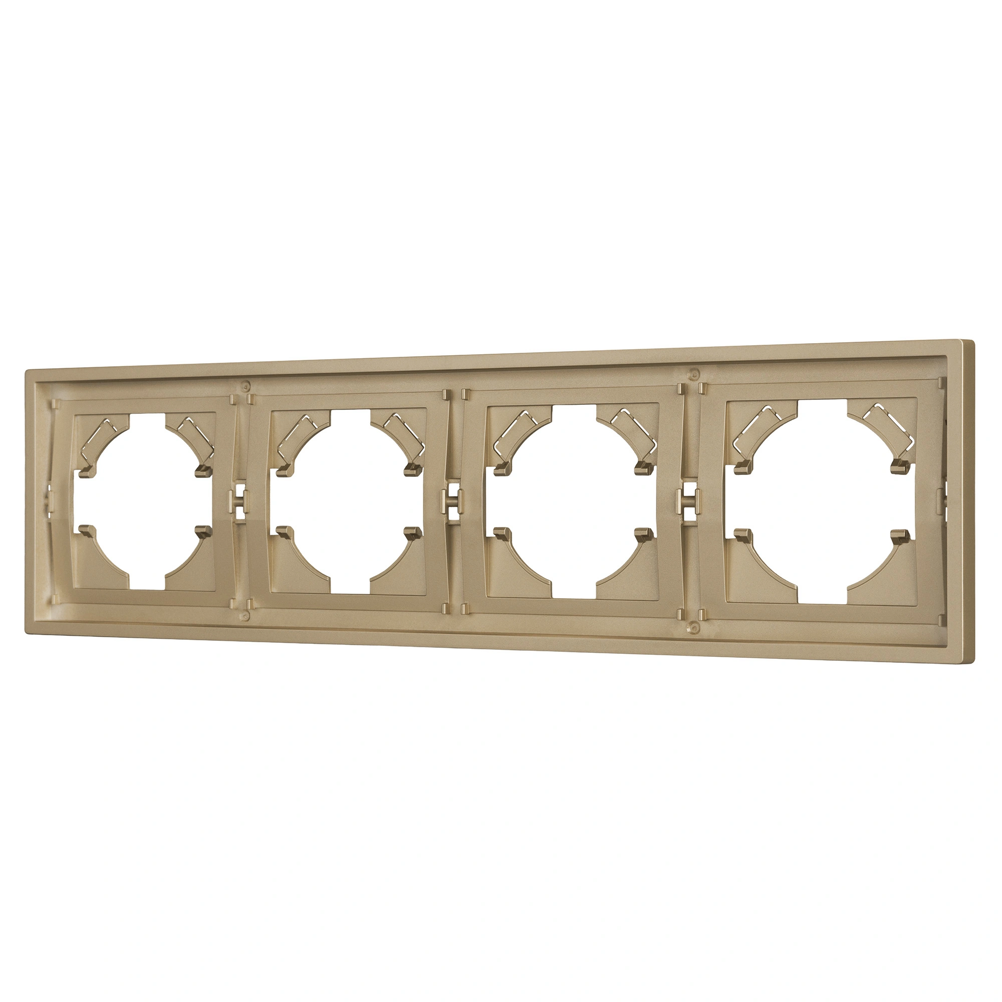 Рамка пластиковая на 4 поста, под встраиваемый механизм. Цвет - золотой, с Soft-Touch покрытием. Среднего уровня герметичности IP20. Ориентация монтажа горизонтальная.