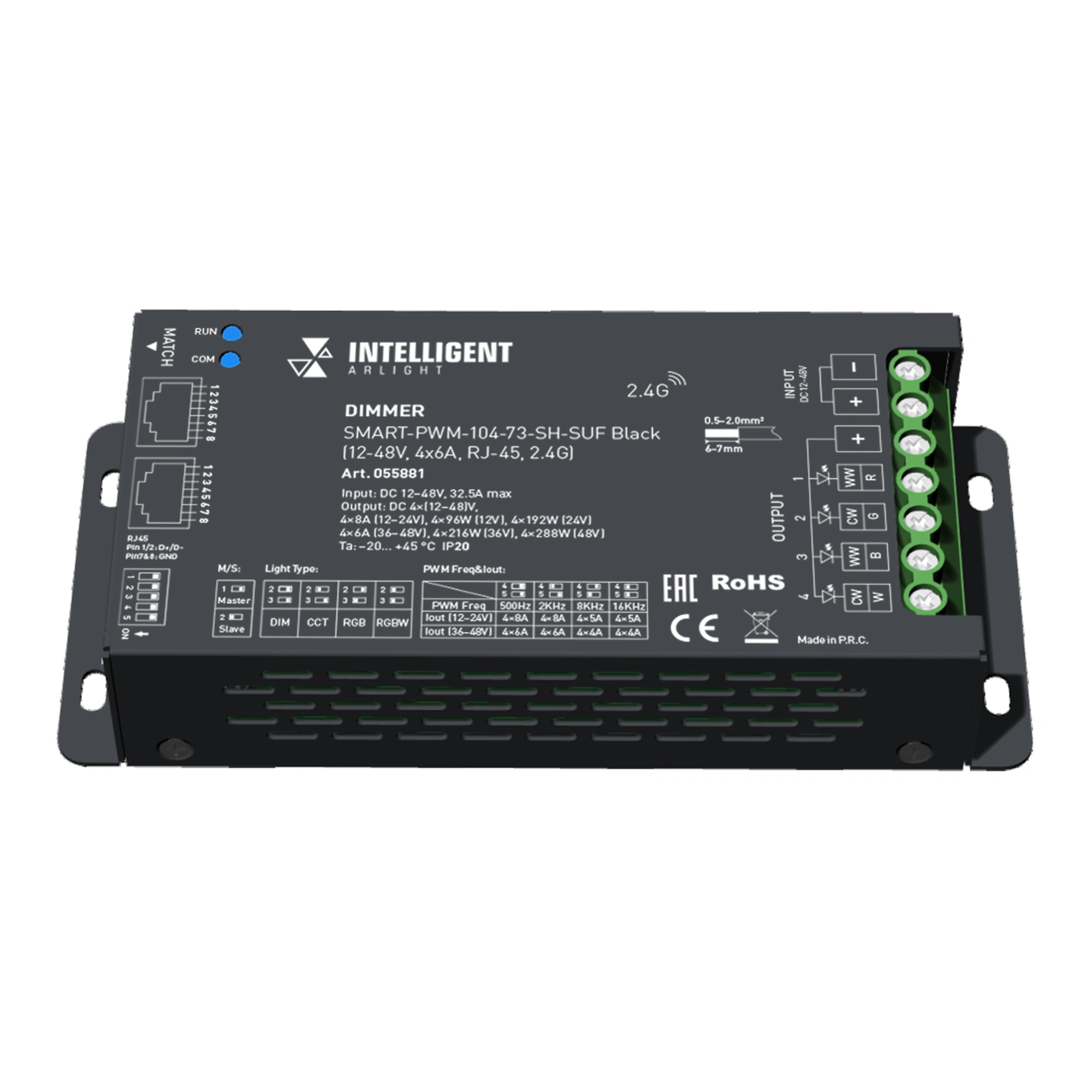 Характеристики - INTELLIGENT ARLIGHT Диммер SMART-PWM-104-73-SH-SUF Black (12-48V, 4x6A, RJ-45, 2.4G) (IARL, IP20 Металл, 5 лет)