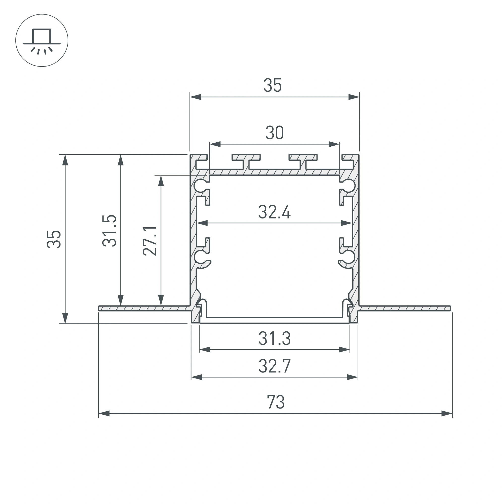 Алюминиевый светотехнический профиль для установки светодиодной ленты или линейки. Цвет серебристый. Длина 3000 мм, размер сечения 73х35 мм. Монтаж осуществляется встраиваемым способом. Фланцы закрашиваются, что позволяет скрыть алюминиевые части профиля, в результате видна только световая линия. Рассеиваемая тепловая мощность 46 Вт/м позволяет подобрать источник света как для основного освещения, так и для мягкой декоративной подсветки. Профиль охлаждает светодиодную ленту, продлевая срок её службы и сохраняя яркость, а также защищает от воздействия пыли, влаги и других внешних факторов. Высококачественное анодированное покрытие защищает профиль от внешних воздействий и коррозии. Светотехнический профиль - отличное решение для создания современных световых проектов.