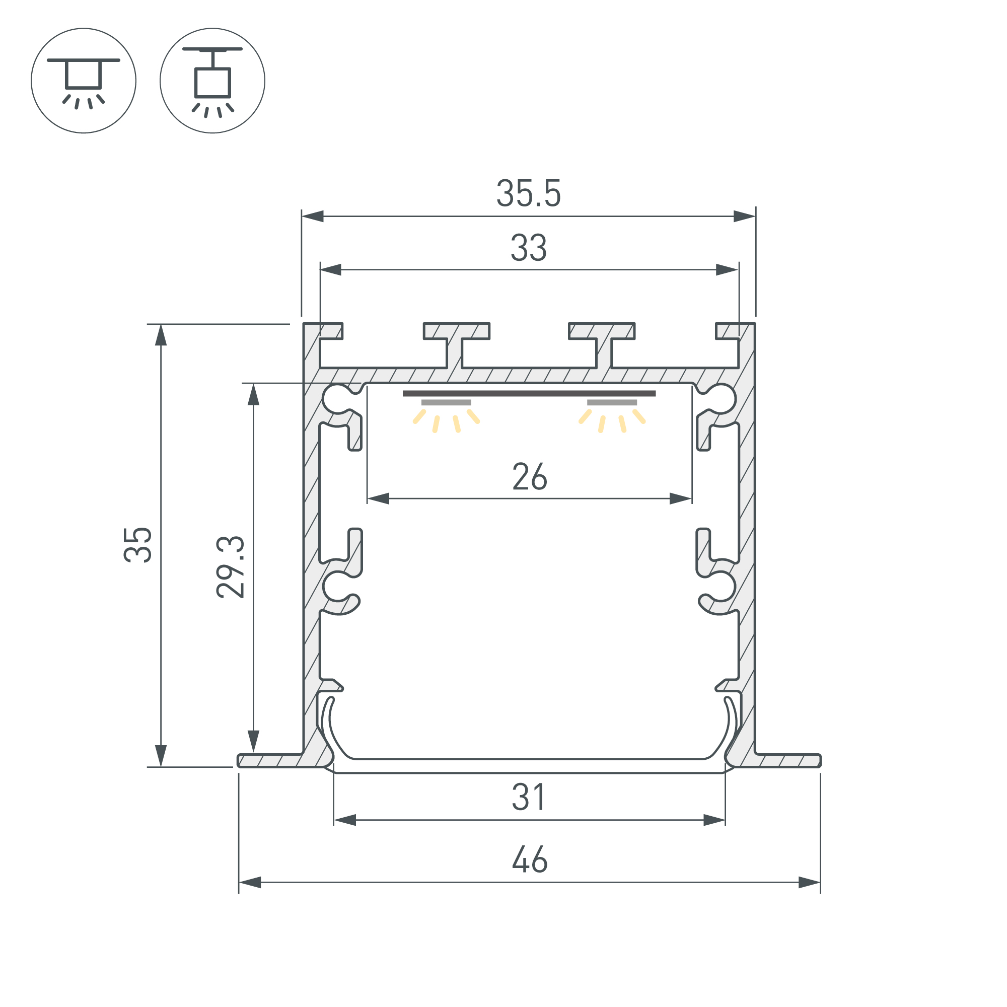 Встраиваемый профиль с накладным фланцем черного цвета из алюминия для основного освещения и контурной подсветки. Габаритные размеры профиля составляют 2000 мм в длину, 46 мм в ширину и 35,5 мм в высоту. Площадка для установки светодиодных лент позволяет использовать ленту шириной до 26 мм и мощностью до 37 Вт/м. Это обеспечивает гибкость в выборе светодиодных лент и создает потрясающие световые решения. Экраны, заглушки и другие аксессуары не включены в комплект и приобретаются отдельно. Цена указана за 1 метр профиля. Отличное решение для создания современных световых проектов. При изготовлении светильников длиной, превышающей длину профиля, соединители необходимо крепить к стенками профиля винтами с минимальным усилием, до первого ощущения сопротивления.