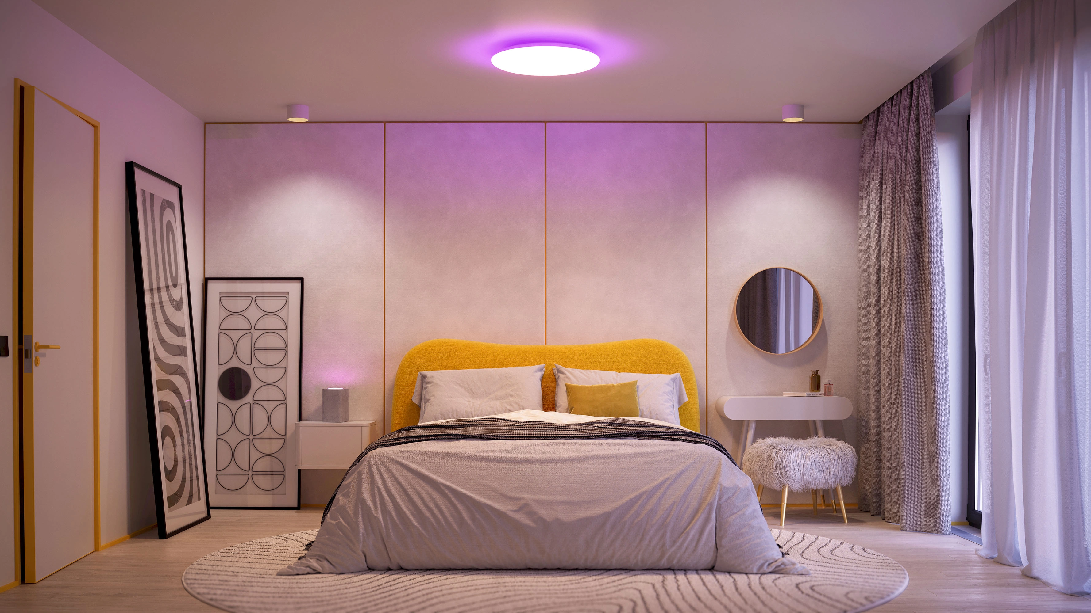 Современный накладной светодиодный светильник FAVOR мощностью 50 Вт для функционального и декоративного освещения. Сочетает две независимые зоны подсветки: верхнюю RGB‑подсветку (полноцветная палитра) и нижнюю подсветку с регулируемой цветовой температурой (от тёплого 2700К до холодного белого 6500К). Управляется через мобильное приложение по протоколу TUYA Zigbee - идеально для систем «умный дом».