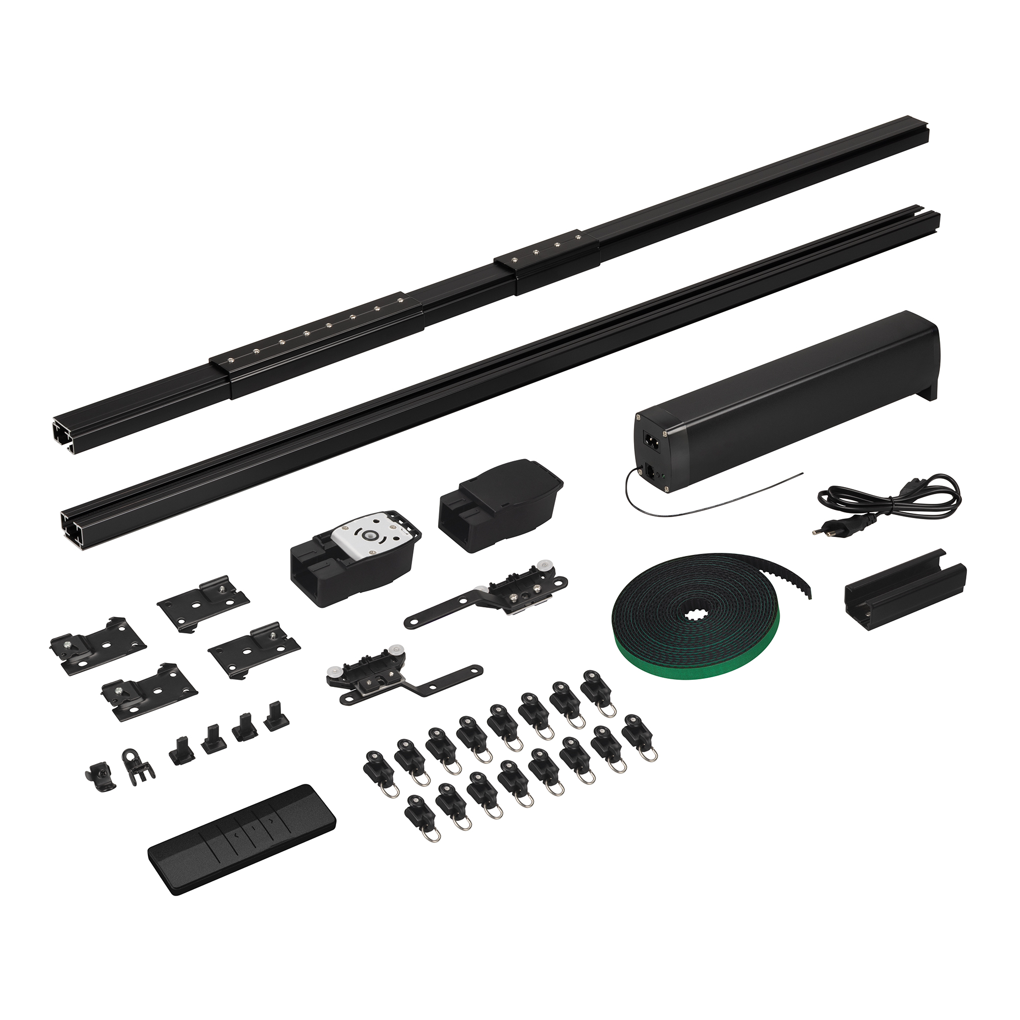 Полный комплект черного электрокарниза из металлического профиля с мотором. Готовое решение для установки карниза, который будет управляться дистанционно пультом, с помощью приложения на телефоне, голосовым помощником, либо вручную. Возможность выбора нужной длины благодаря наборным частям.