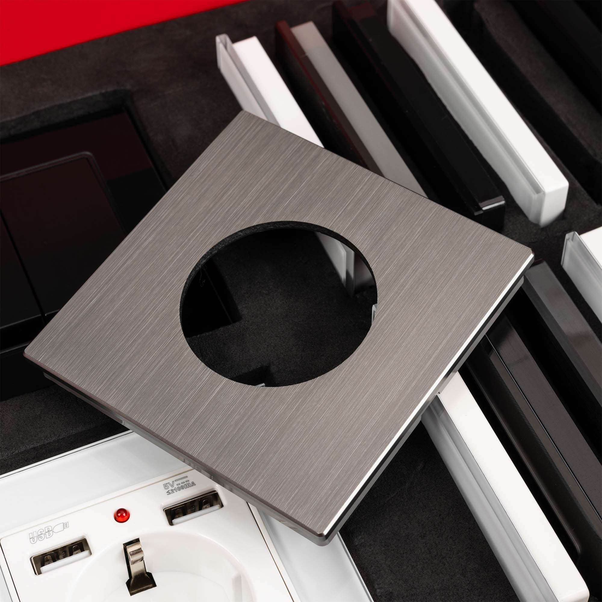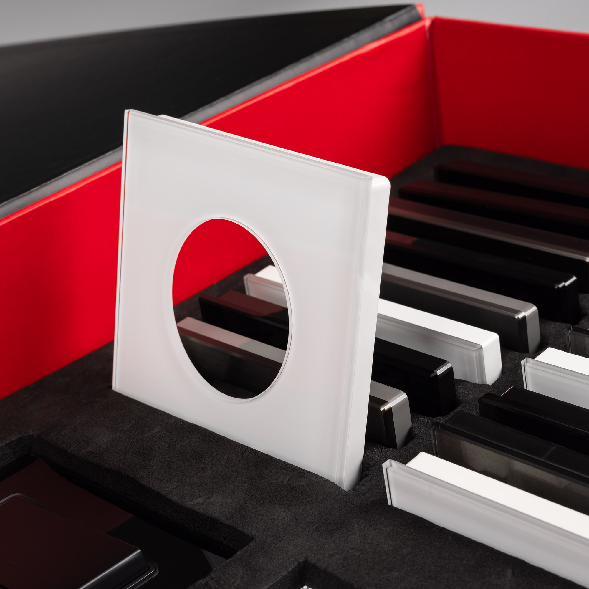 Демо-кейс с наполнением электроустановочных изделий серий VERSA, GLARE, PRESTO и сопутствующих механизмов. Демо-кейс содержит: Рамки серии VERSA в цветах белый, черный и серебристый (серый); Рамки серии GLARE в цветах белый, черный и серебристый (серый), в двух вариациях: со стандартным вырезом (квадрат) и с круглым вырезом (совместимые с механизмами арт. 043740/043739/043741); Рамки серии PRESTO в цветах черный и серебристый (серый), в двух вариациях: со стандартным вырезом (квадрат) и с круглым вырезом (совместимые с механизмами арт. 043740/043739/043741); Механизм выключателя на две клавиши (проходной) в черном цвете - арт.043728 Механизм компьютерной розетки (двойной) в белом цвете - арт.045336 Механизм розетки с дополнительными USB Type A выходами в белом цвете - арт.043733 Механизм розетки под евровилку в серебристом(сером) цвете - арт.043741. Рамки представленных серий накладного типа монтажа - не требуют дополнительного оборудования для установки рамки на механизме.