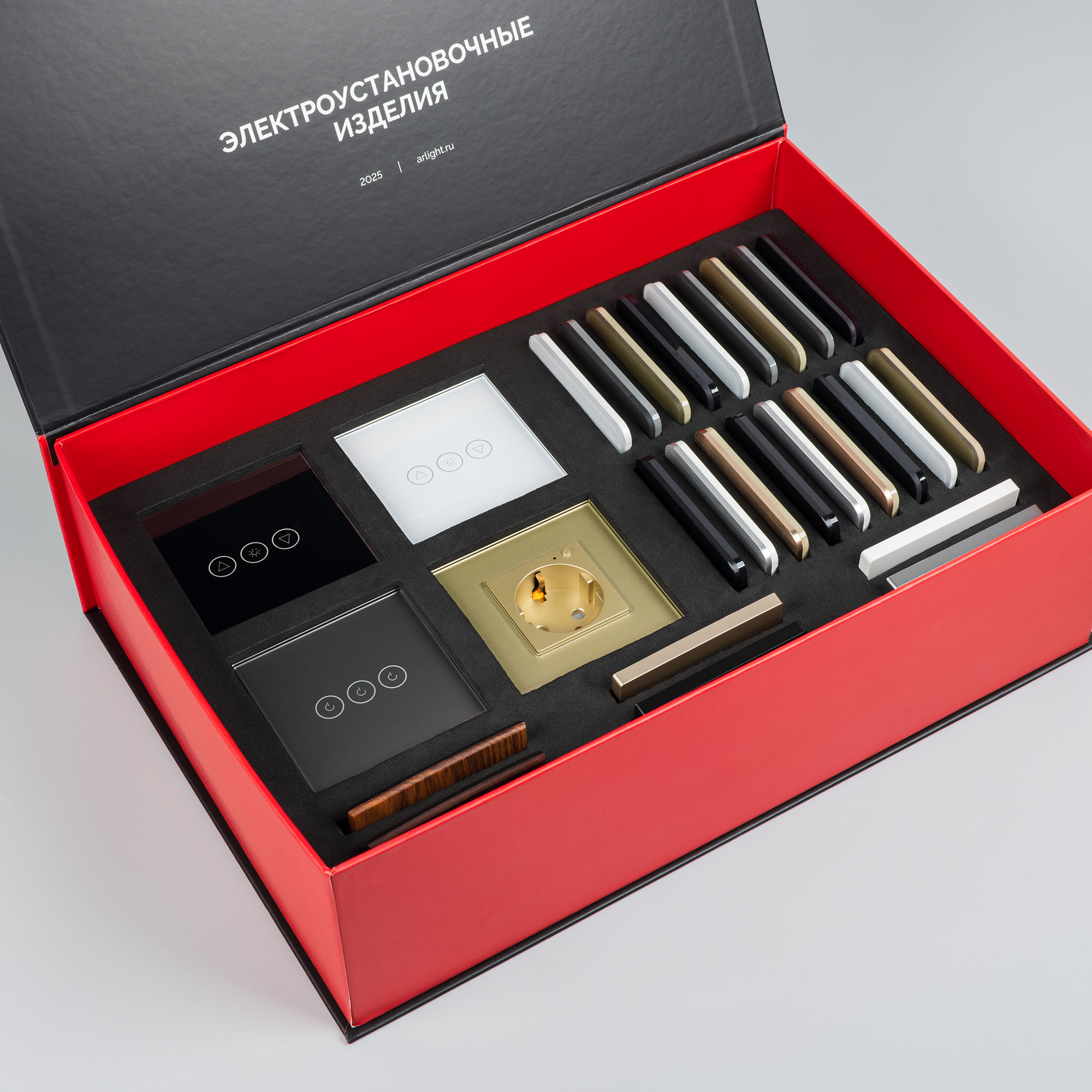 Демо-кейс с наполнением электроустановочных изделий серий AKIRY, PERIO, OMALI, XSILO и готовые решения серии умных устройств OMALI. Демо-кейс содержит: Рамки серии AKIRY в цветах золотой, черный и серебристый (серый). Поверхность рамок имеет сатинированное и Soft-Touch покрытие; Рамки серии PERIO в цветах белый, черный, золотой и серебристый (серый). Поверхность рамок имеет матовое покрытие; Рамки серии OMALI в цветах белый, черный, золотой и серебристый (серый). Поверхность рамок имеет глянцевое и Soft-Touch покрытие; Рамки серии XSILO в цветах светлого и темного дерева, рисунок структуры которых уникальный для каждой рамки. Выключатель сенсорный OMALI на три клавиши в серебристом(сером) цвете - арт. 050047 Светорегулятор сенсорный OMALI на три клавиши в черном и белом цвете - арт. 050053 / 050060 Розетка OMALI с Zigbee управлением в золотом цвете - арт. 050218 Умные устройства серии OMALI являются готовым решением, которое не требует дополнительной комплектации в виде рамки. Рамки представленные в данном демо-кейсе сочетаются с механизмами одноименных серий.