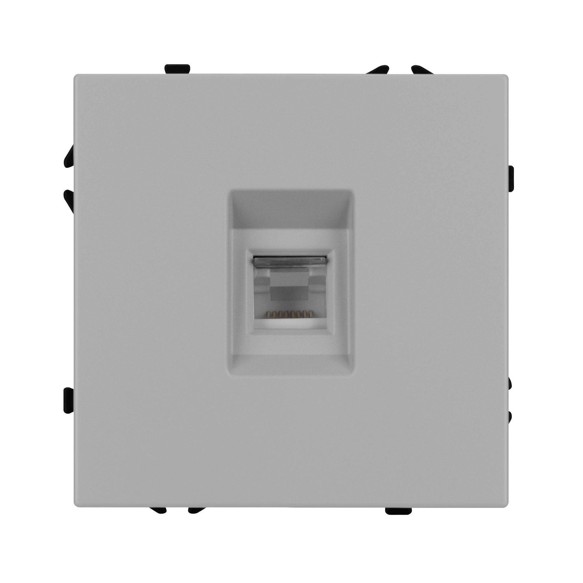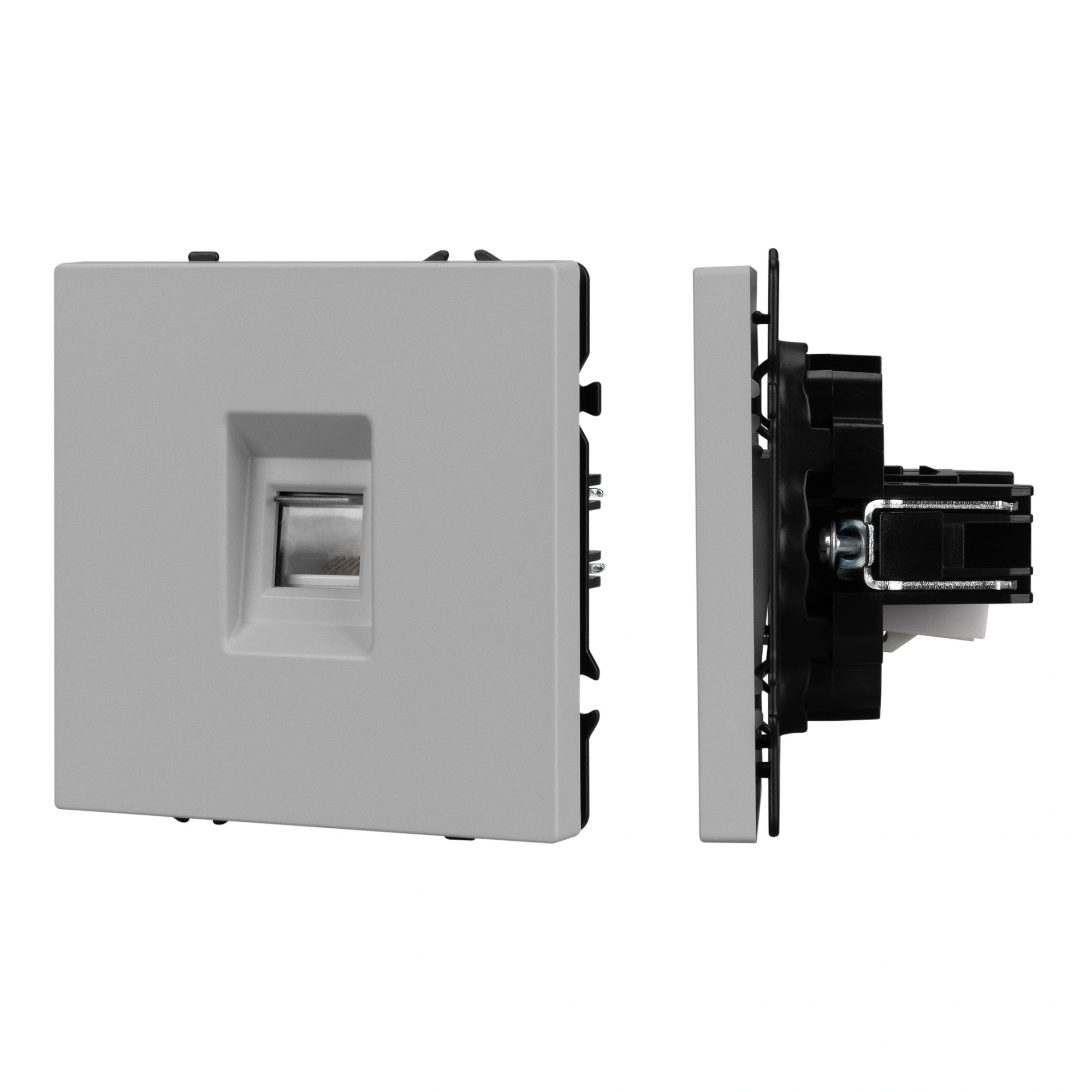 Строгие геометрические линии гармонично сочетаются с функциональностью продуманных механизмов, создавая идеальное решение для дизайн-проектов, где важны как эстетика, так и практичность. Механизм компьютерной розетки совместим с рамками серии NOBE, создает утонченный минималистичный вид. Скрытый тип монтажа позволяет гармонично встроить в интерьер любого современного дизайн-проекта. Видимая часть механизма выполнена из высококачественного пластика цвета никель и имеет Soft-Touch покрытие, что придает изделию приятные тактильные ощущения и стильный внешний вид. Выходной порт RJ-45 (Female) формата 8P8C соответствует категории 6 (Cat.6), что поддерживает высокоскоростные соединения до 10 Гбит/с на расстоянии до 55 метров. Самозакрывающаяся крышка защищает выходной порт от повреждения и загрязнения внешних контактов разъема. Контактная часть выполнена по технологии IPC (изоляционно–пробивающего контакта) с нанесением цветной маркировки схемы разводки на корпус, позволяя быстро и легко подсоединить механизм компьютерной розетки к большинству многожильных кабелей типа UTP (неэкранированные). А усиленные распорные лапки двойного захвата надежно фиксируют механизм в установочном подрозетнике круглого сечения диаметром 60мм. Суппорт окрашен в черный матовый цвет под основу механизма и выполнен из металла толщиной 1,5мм, что обеспечивает безопасность и уверенность в установке. На каждой стороне суппорта размещены фиксирующие элементы, позволяющие комбинировать механизмы в системы до 5шт как горизонтально, так и вертикально.