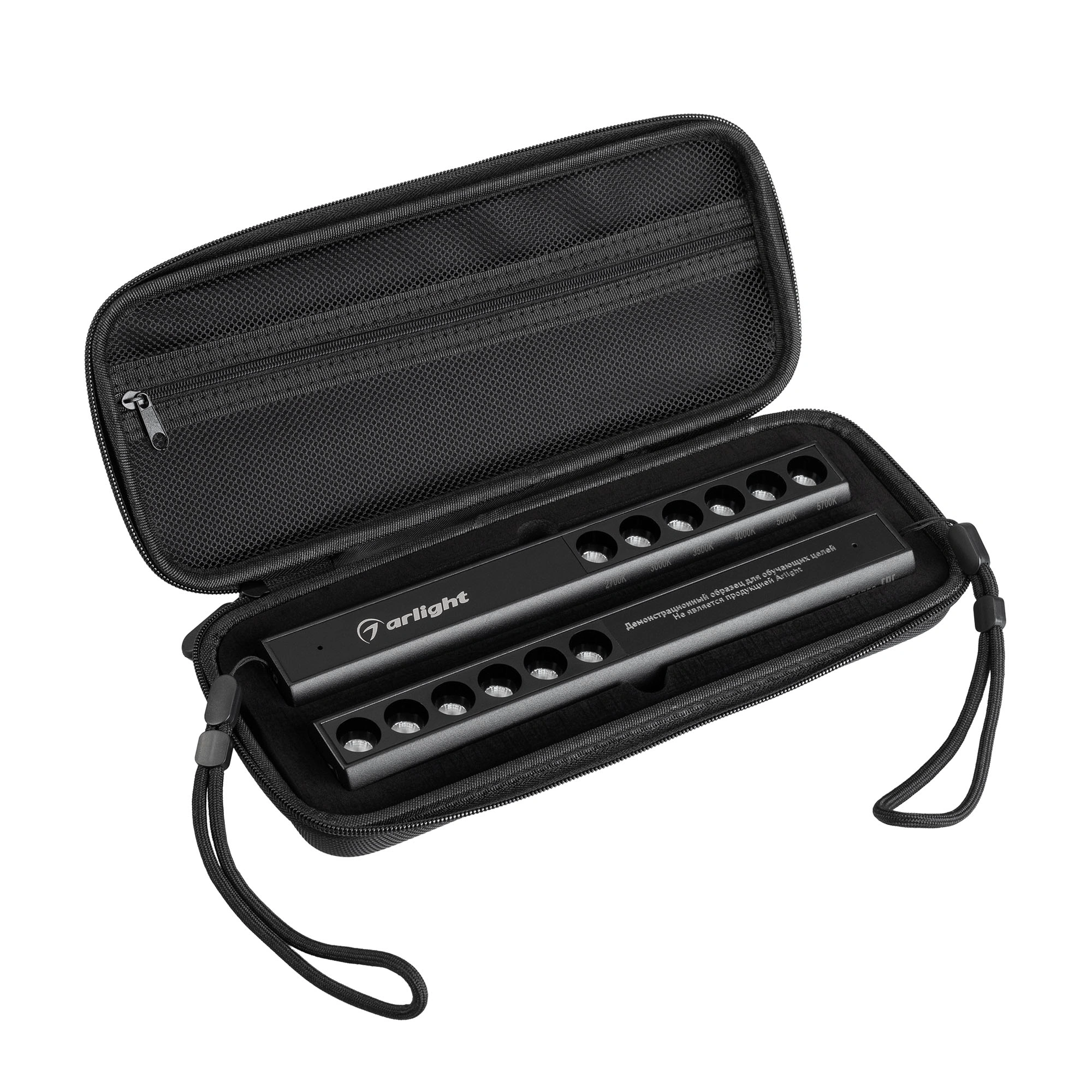 Демо-кейс для демонстрации переносных светильников мощностью 3Вт со встроенным аккумулятором, с регулировкой яркости и 6 оттенками цвета свечения (теплый 2700K, теплый 3000K, теплый 3500K, дневной 4000K, дневной 5000K, белый 5700K). У светильников разный индекс цветопередачи - CRI70 и CRI90. Габариты кейса 280x110x50мм. Размер светильников: длина 228 мм, ширина 31 мм, высота 26 мм. В комплект входят сумка-кофр, 2 светильника.