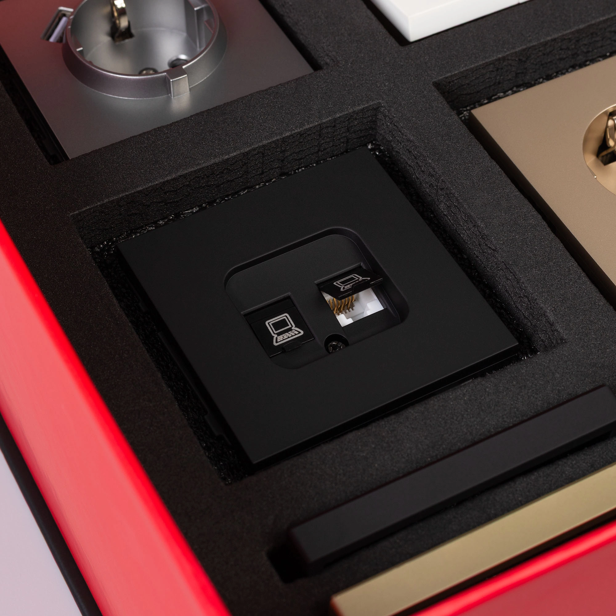 Демо-кейс с наполнением электроустановочных изделий серии TENDO. Демо-кейс содержит: Рамки серии TENDO в цветах белый, черный, золотой и серебристый (серый). Поверхность рамок имеет матовое и Soft-Touch покрытие; Механизм компьютерной розетки (двойной) в черном цвете - арт.054595 Механизм розетки с дополнительными USB Type A + Type A выходами в серебристом(сером) цвете - арт.054084 Механизм выключателя на две клавиши (проходной) в белом цвете - арт.054556. Механизм розетки под евровилку в золотом цвете - арт. 054081 Рамки представленной серии накладного типа монтажа - не требуют дополнительного оборудования для установки рамки на механизме.