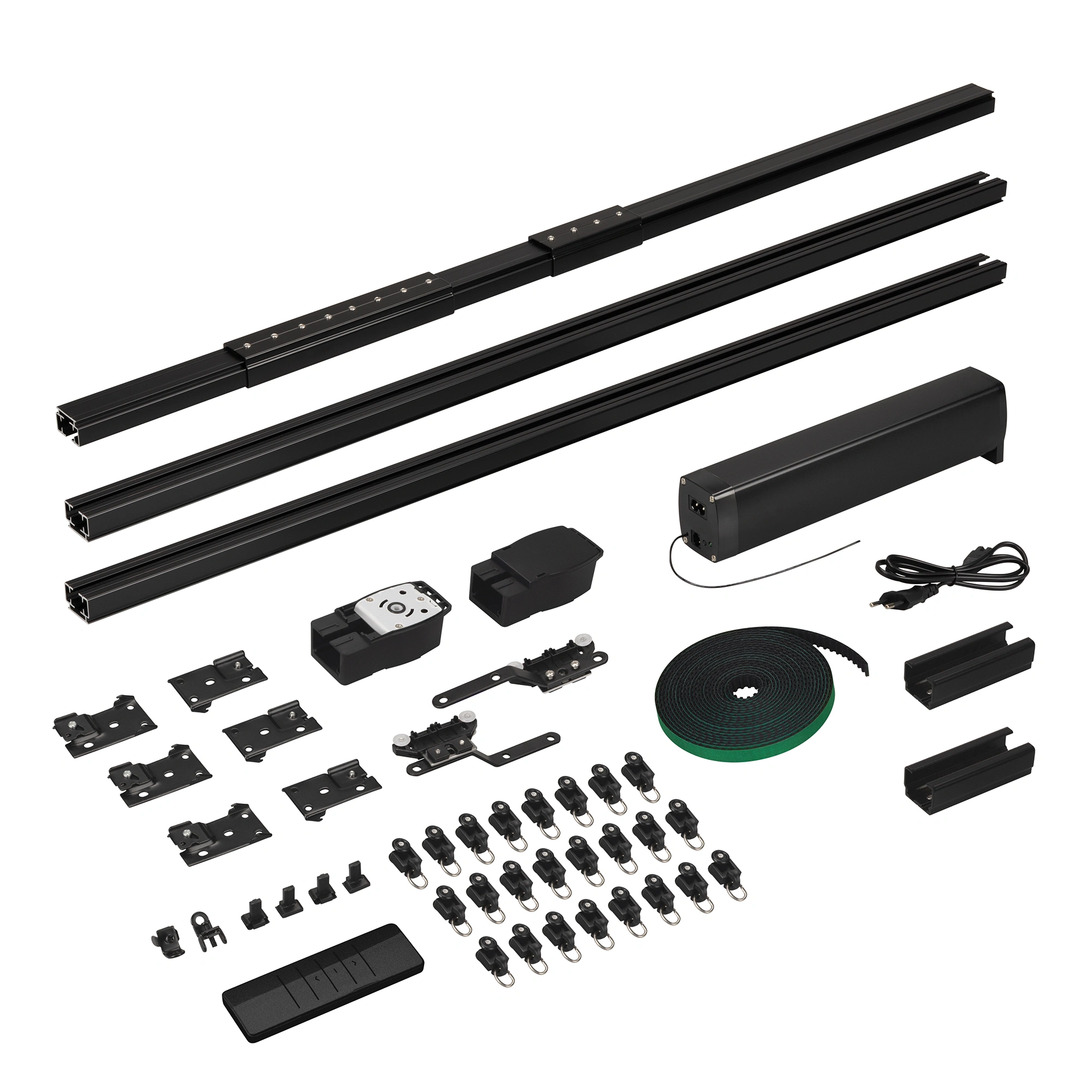 Полный комплект черного электрокарниза из металлического профиля с мотором. Готовое решение для установки карниза, который будет управляться дистанционно пультом, с помощью приложения на телефоне, голосовым помощником, либо вручную. Возможность выбора нужной длины благодаря наборным частям.