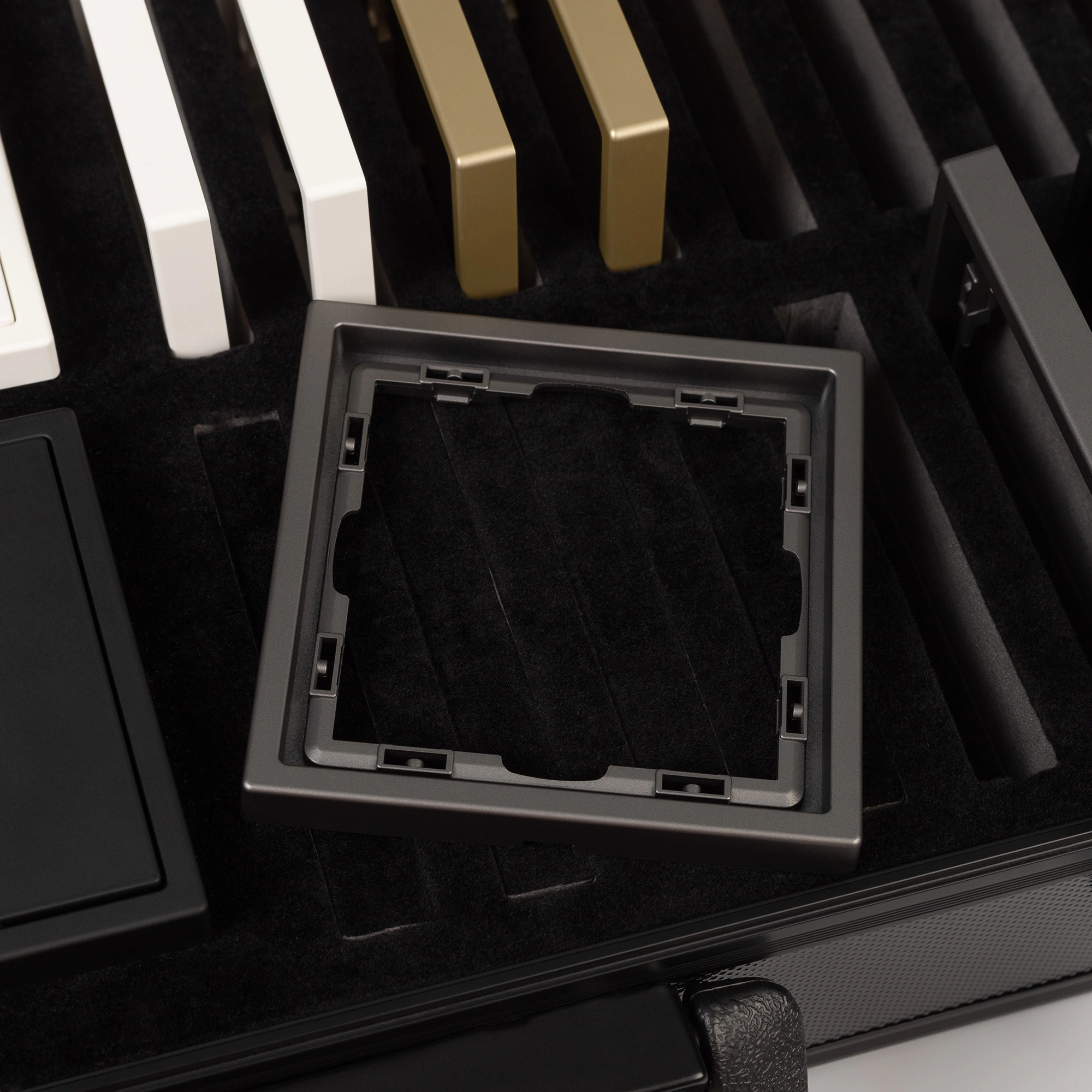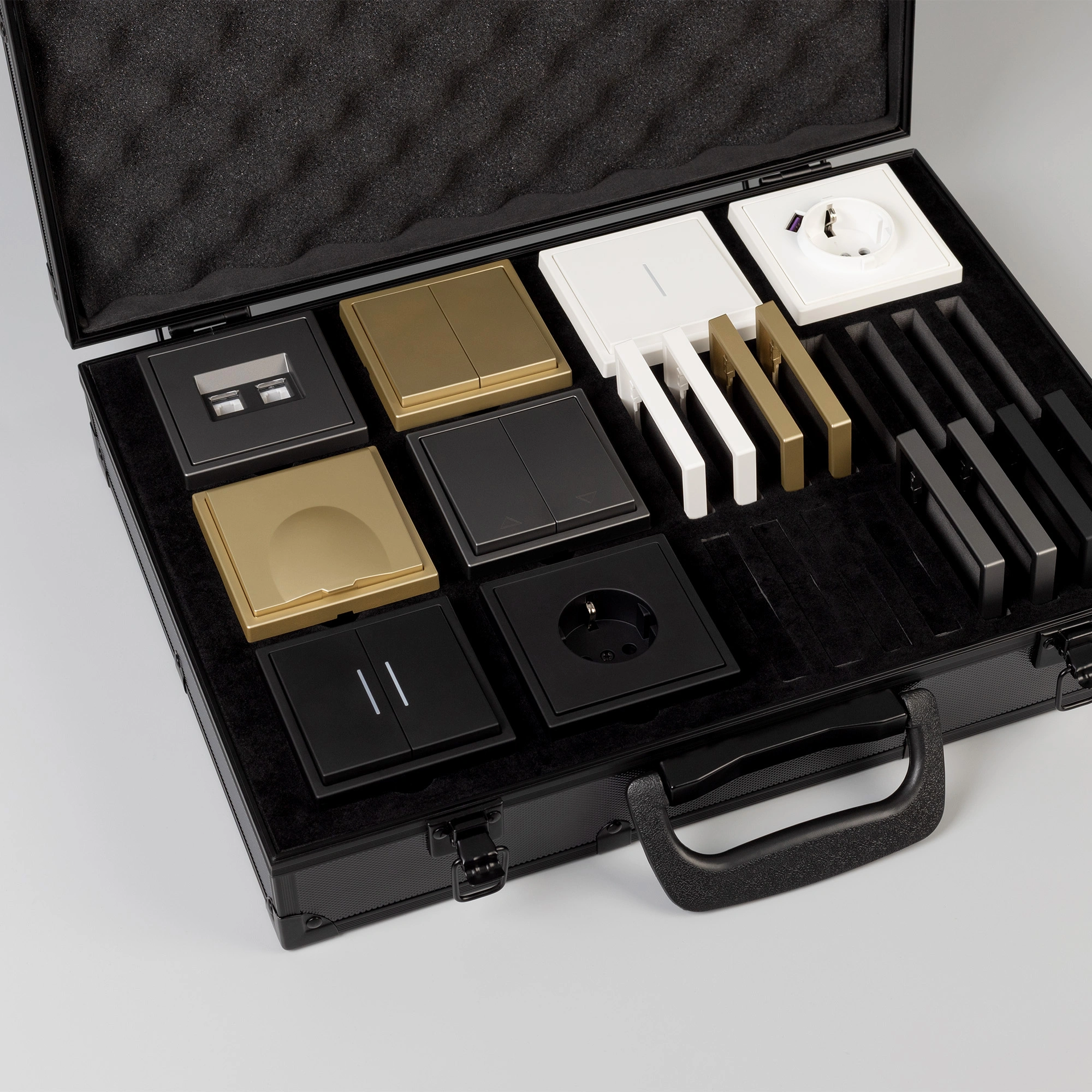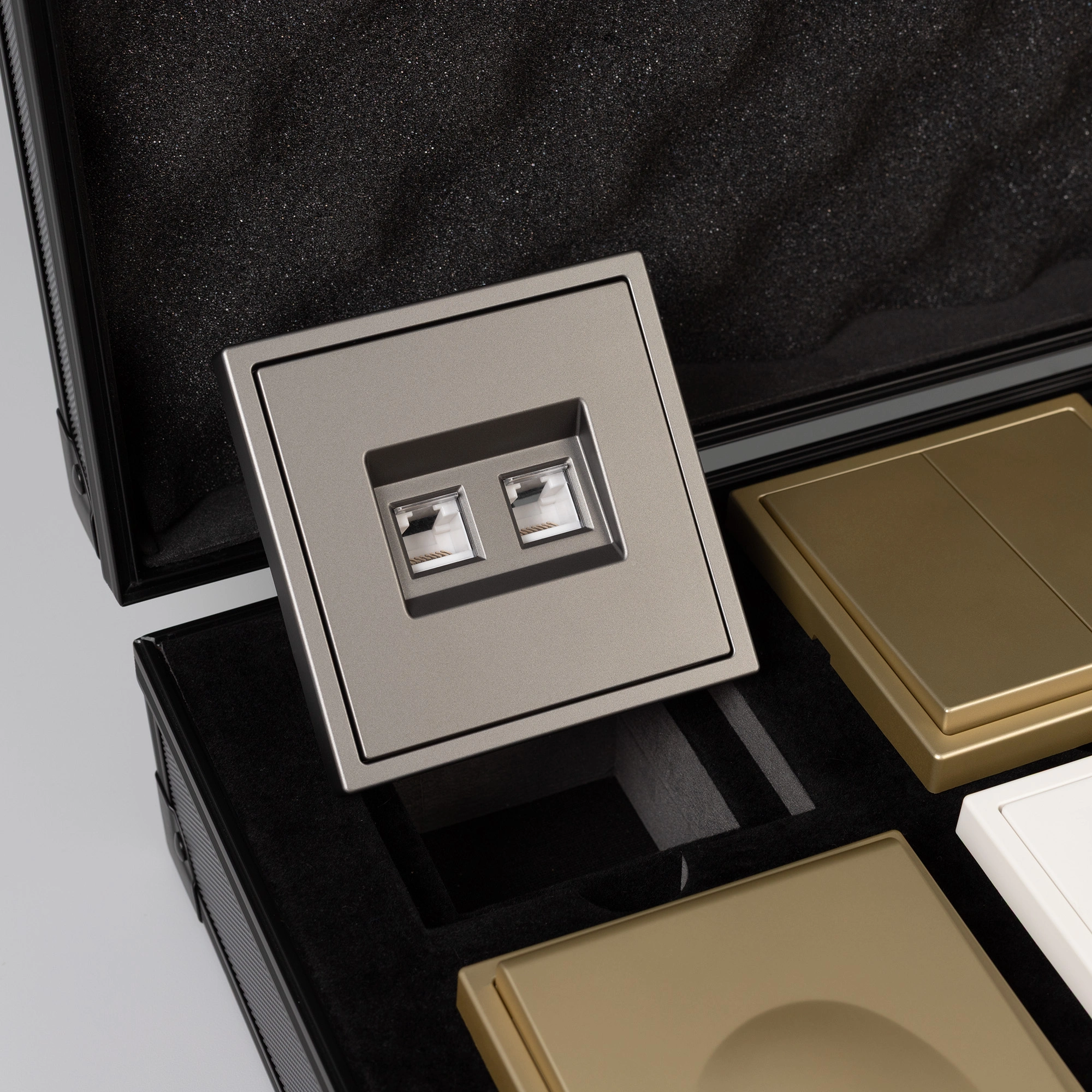 Демо-кейс с наполнением серии NOBE. Демо-кейс содержит: Рамки серии NOBE в цветах белый, черный, золотой и серебристый (серый). Поверхность рамок имеет Soft-Touch покрытие: арт.054212 - 4шт арт.054213 - 4шт арт.054214 - 4шт арт.054211 - 4шт Механизм компьютерной розетки (двойной) в серебристом (сером) цвете - арт.054315 Механизм розетки с дополнительными USB Type A + Type С выходами в белом цвете - арт.054284 Механизм выключателя на две клавиши (непроходной) в золотом цвете - арт.054253. Механизм выключателя на две клавиши с подсветкой LED (непроходной) в черном цвете - арт.054264. Механизм розетки под евровилку в черном цвете - арт.054277 Механизм розетки влагозащищенный в золотом цвете - арт.054282 Механизм выключателя на одну клавишу с подсветкой LED (непроходной) в белом цвете - арт.054232 Механизм выключателя управления шторами на две клавиши перекидные в серебристом(сером) цвете - арт.054275 Рамки представленной серии накладного типа монтажа - не требуют дополнительного оборудования для установки рамки на механизме.