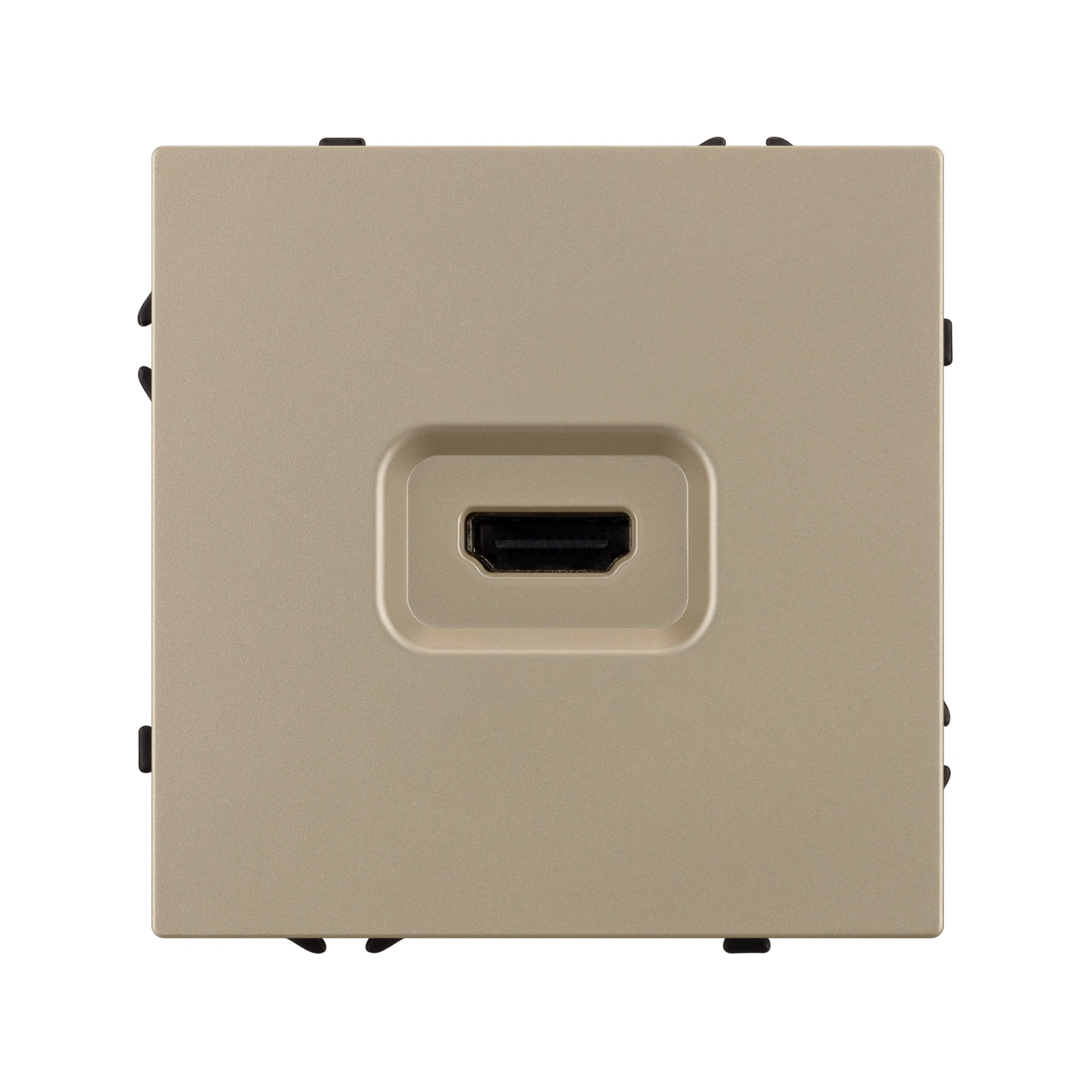 Строгие геометрические линии гармонично сочетаются с функциональностью продуманных механизмов, создавая идеальное решение для дизайн-проектов, где важны как эстетика, так и практичность. Механизм HDMI розетки совместим с рамками серии NOBE, создает утонченный минималистичный вид. Скрытый тип монтажа позволяет гармонично встроить в интерьер любого современного дизайн-проекта. Видимая часть механизма выполнена из высококачественного пластика цвета золотой песок и имеет Soft-Touch покрытие, что придает изделию приятные тактильные ощущения и стильный внешний вид. Выходной порт HDMI (Female). А усиленные распорные лапки двойного захвата надежно фиксируют механизм в установочном подрозетнике круглого сечения диаметром 60мм. Суппорт окрашен в черный матовый цвет под основу механизма и выполнен из металла толщиной 1,5мм, что обеспечивает безопасность и уверенность в установке. На каждой стороне суппорта размещены фиксирующие элементы, позволяющие комбинировать механизмы в системы до 5шт как горизонтально, так и вертикально.