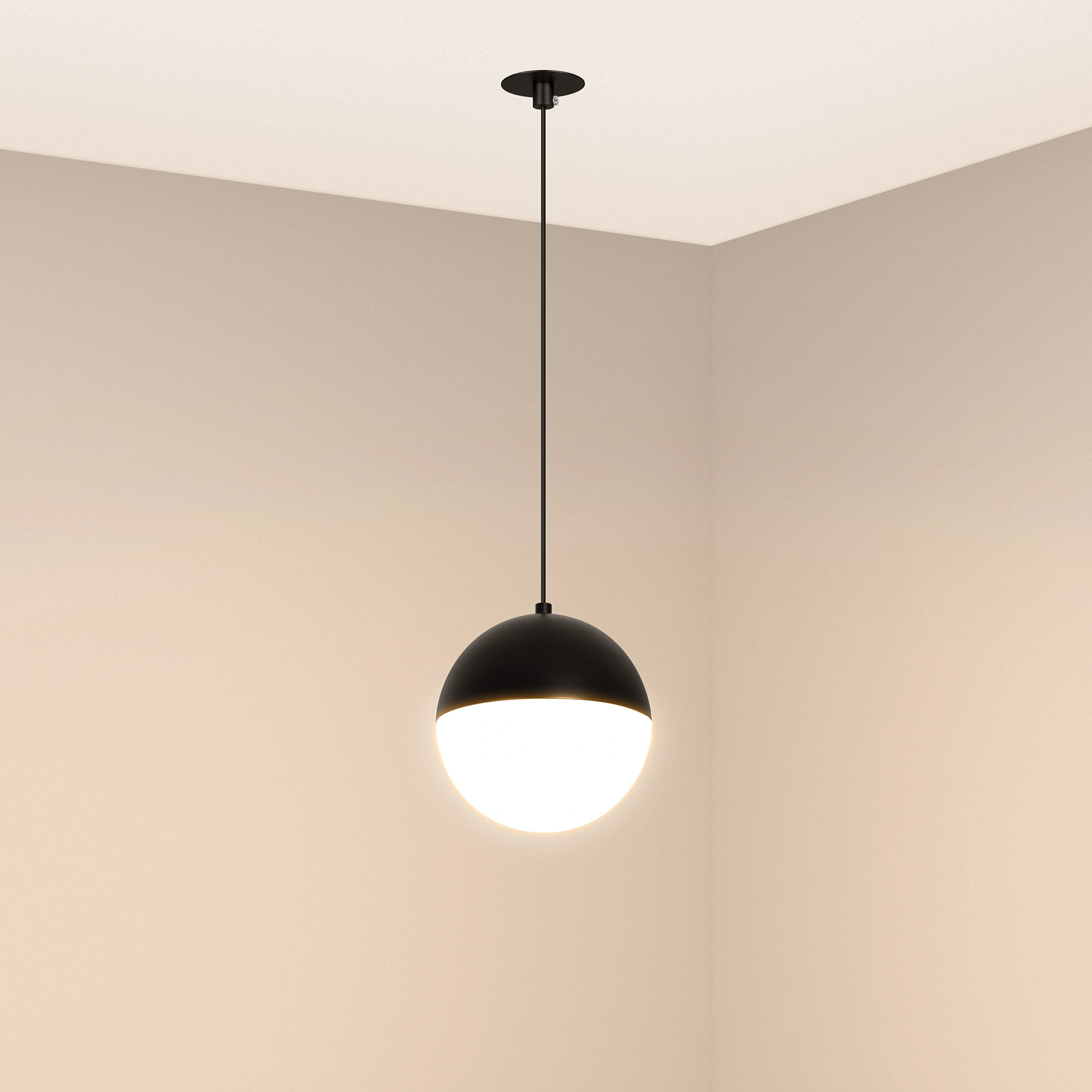 Элегантный подвесной светильник со встраиваемой чашей мощностью 11 Вт с теплым белым цветом свечения (3000 К). Для подвесного монтажа на потолок. Матовый плафон с широким углом излучения 170° создает приятное рассеянное свечение и особую теплую атмосферу в любых интерьерах: от частных до коммерческих. Черный корпус на регулируемом подвесе длиной 1500 мм. Диаметр светового модуля 150 мм. Высокий индекс цветопередачи (CRI>90) и световой поток 960 лм для качественного декоративного освещения. Минимальный коэффициент пульсации (менее 1%) гарантирует зрительный комфорт. Встроенный драйвер для подключения к сети 230 В.