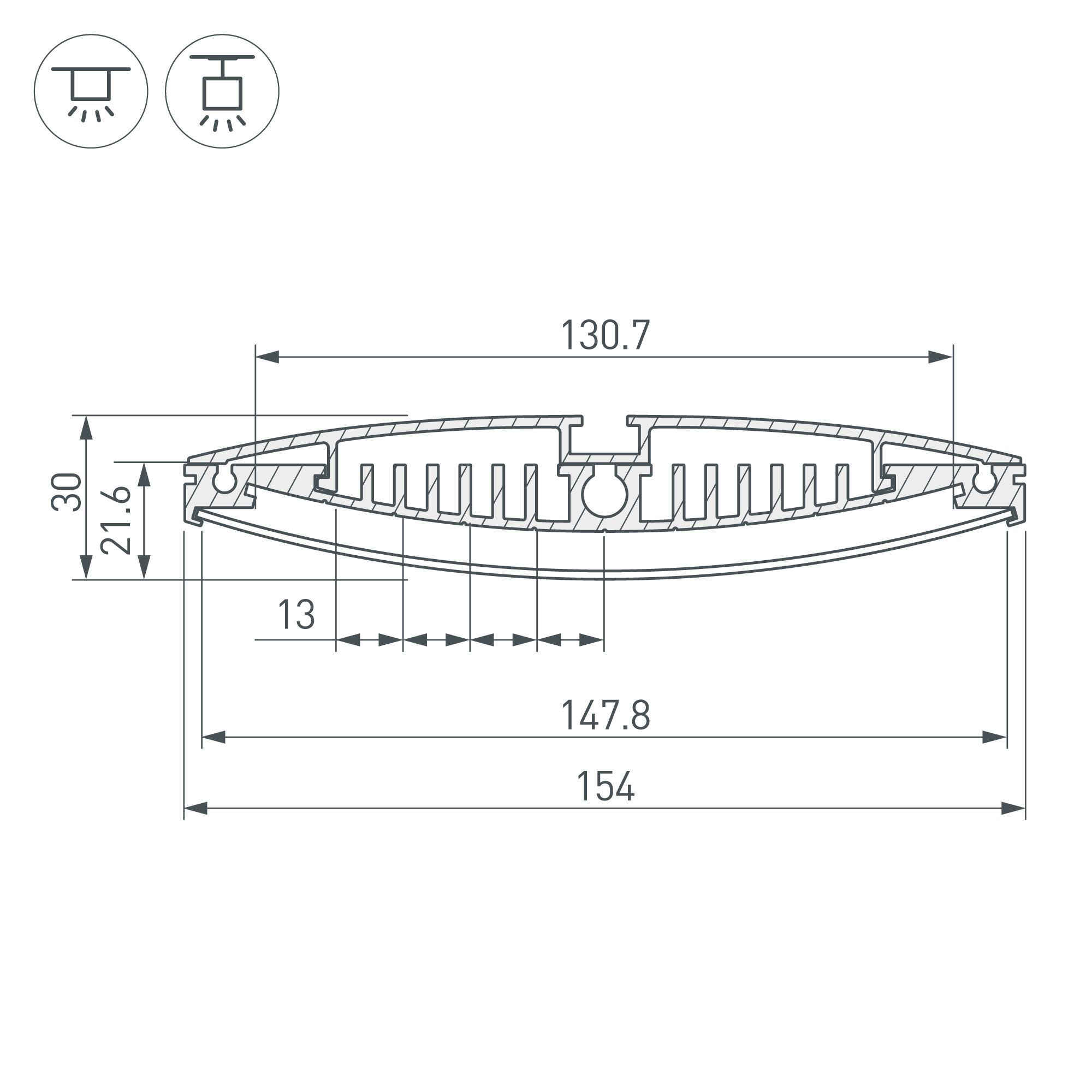 Верхняя часть накладного/подвесного профиля MULTI из анодированного алюминия для основного освещения и контурной подсветки. Габаритные размеры профиля составляют 2000 мм в длину, 154 мм в ширину и 21,6 мм в высоту. Площадка для установки светодиодных лент позволяет использовать ленту шириной до 130 мм и мощностью до 50 Вт/м. Это обеспечивает гибкость в выборе светодиодных лент и создает потрясающие световые решения. Экраны, заглушки и другие аксессуары не включены в комплект и приобретаются отдельно. Цена указана за 1 метр профиля. Отличное решение для создания современных световых проектов.