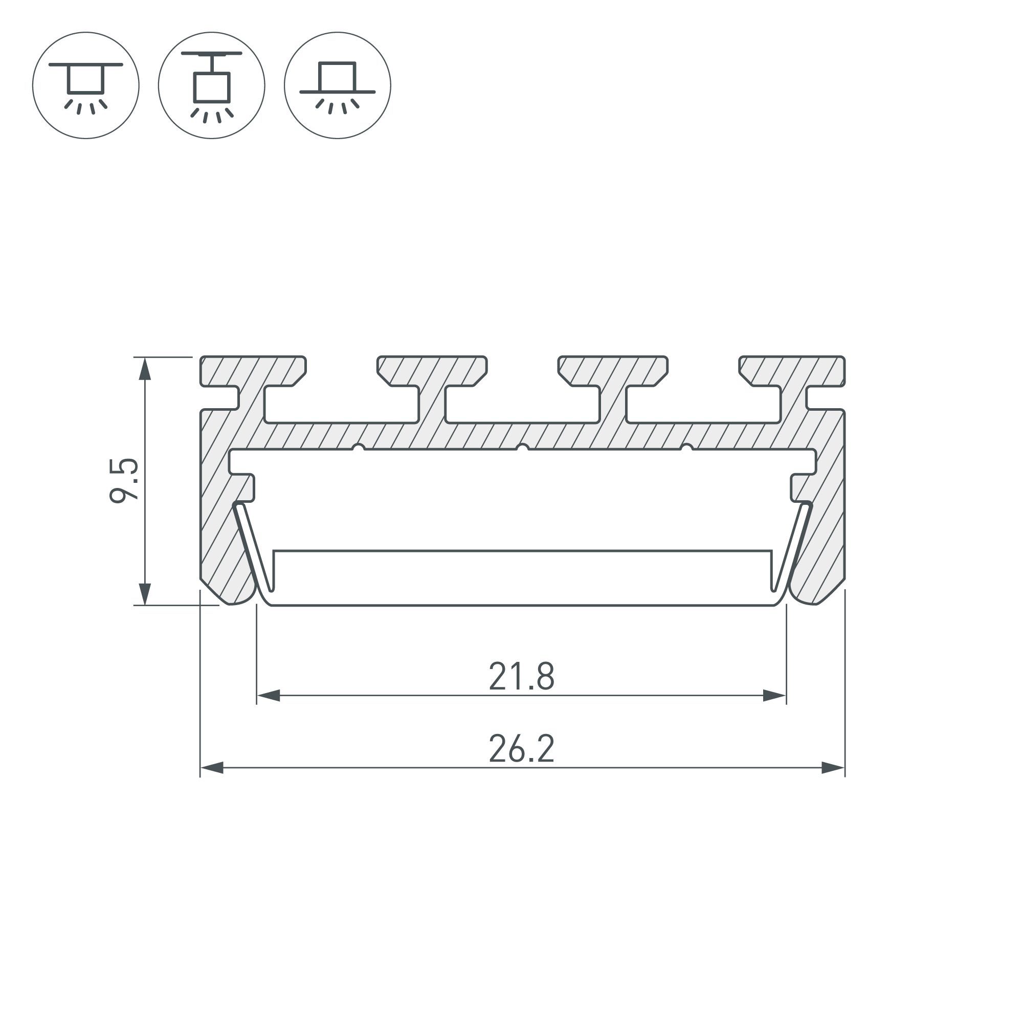 Накладной/подвесной/встраиваемый профиль из анодированного алюминия для основного освещения и контурной подсветки. Габаритные размеры профиля составляют 2000 мм в длину, 26,2 мм в ширину и 9,5 мм в высоту. Площадка для установки светодиодных лент позволяет использовать ленту шириной до 22 мм и мощностью до 18,3 Вт/м. Это обеспечивает гибкость в выборе светодиодных лент и создает потрясающие световые решения. Экраны, заглушки и другие аксессуары не включены в комплект и приобретаются отдельно. Цена указана за 1 метр профиля. Отличное решение для создания современных световых проектов.