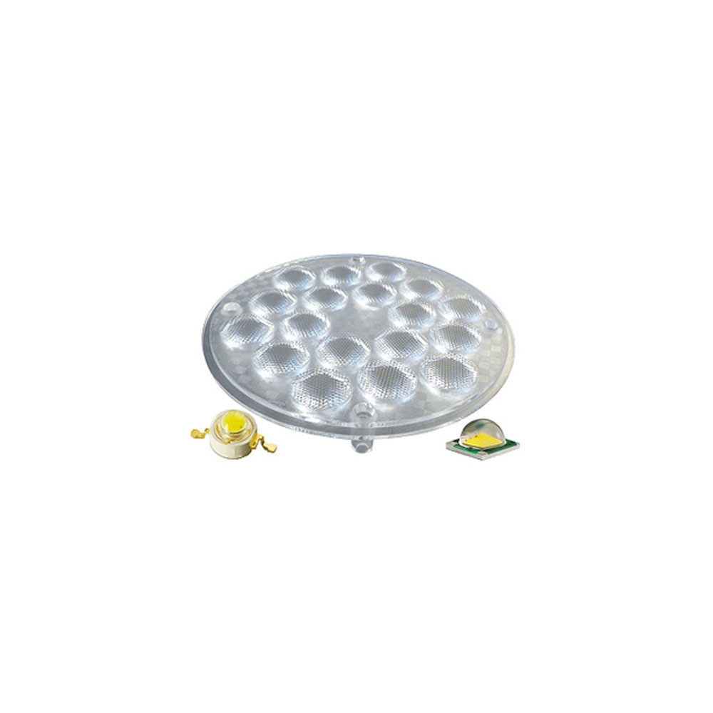 Блок линз 30° для 18шт мощных светодиодов 'Emitter', CREE XP, smd до 5х5мм. Поверхность микролинза Френеля. 3 ножки, под запайку. Габариты D=110мм, H=14.7мм. Используется с платами 013619, 013785.