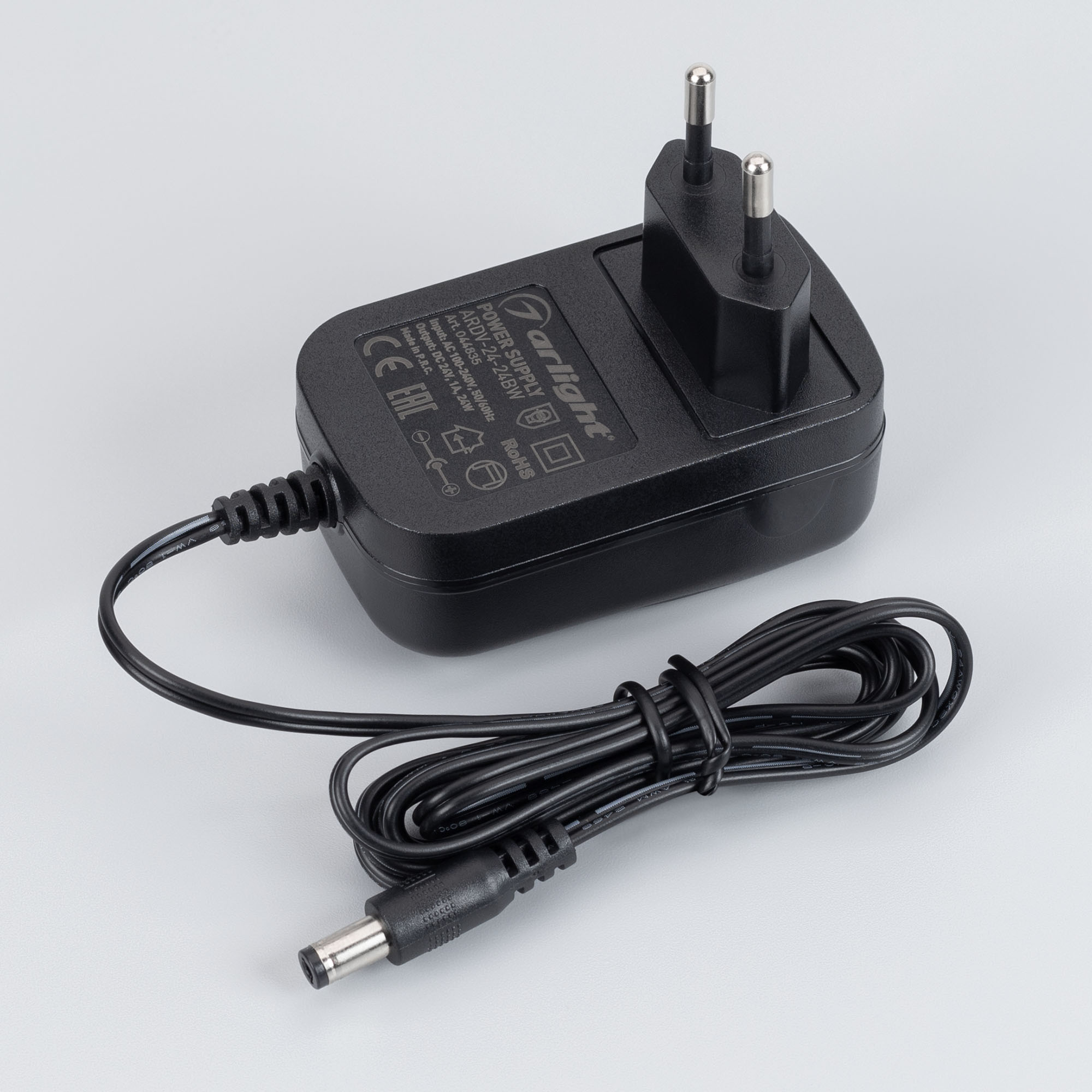 Сетевой адаптер с гальванической развязкой для светодиодных лент 24 В (черный корпус). Мощность 24 Вт. Вход:100-240VAC, Выход: DC24V 1A, длина кабеля 1.5 м, коннектор 5.5x2.1x10мм. Размер 74х35х42 мм (размер без вилки). Гарантия 3 года.
