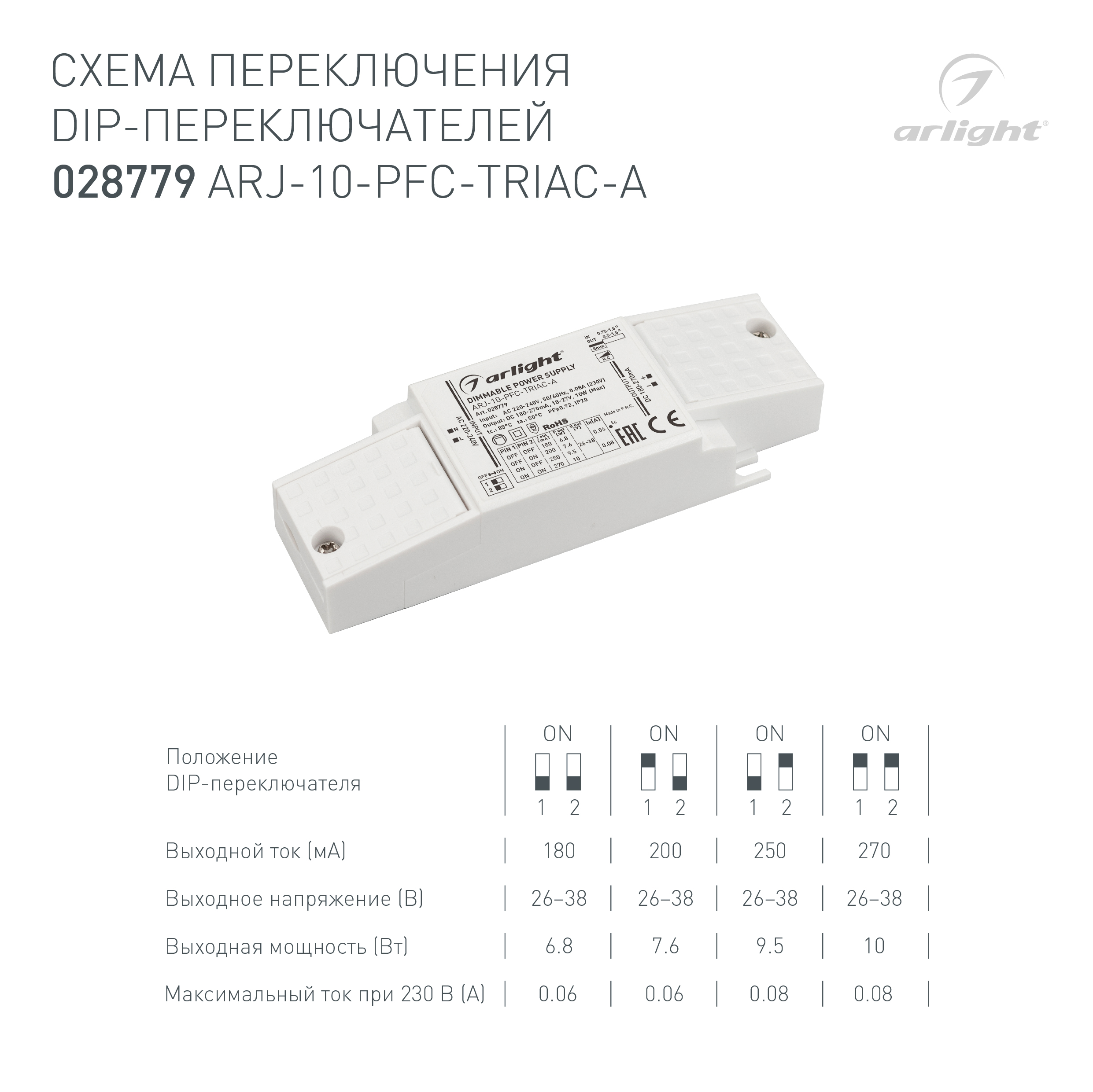 Характеристики - Блок питания ARJ-10-PFC-TRIAC-A (10W, 180-270mA) (Arlight, IP20 Пластик, 5 лет)