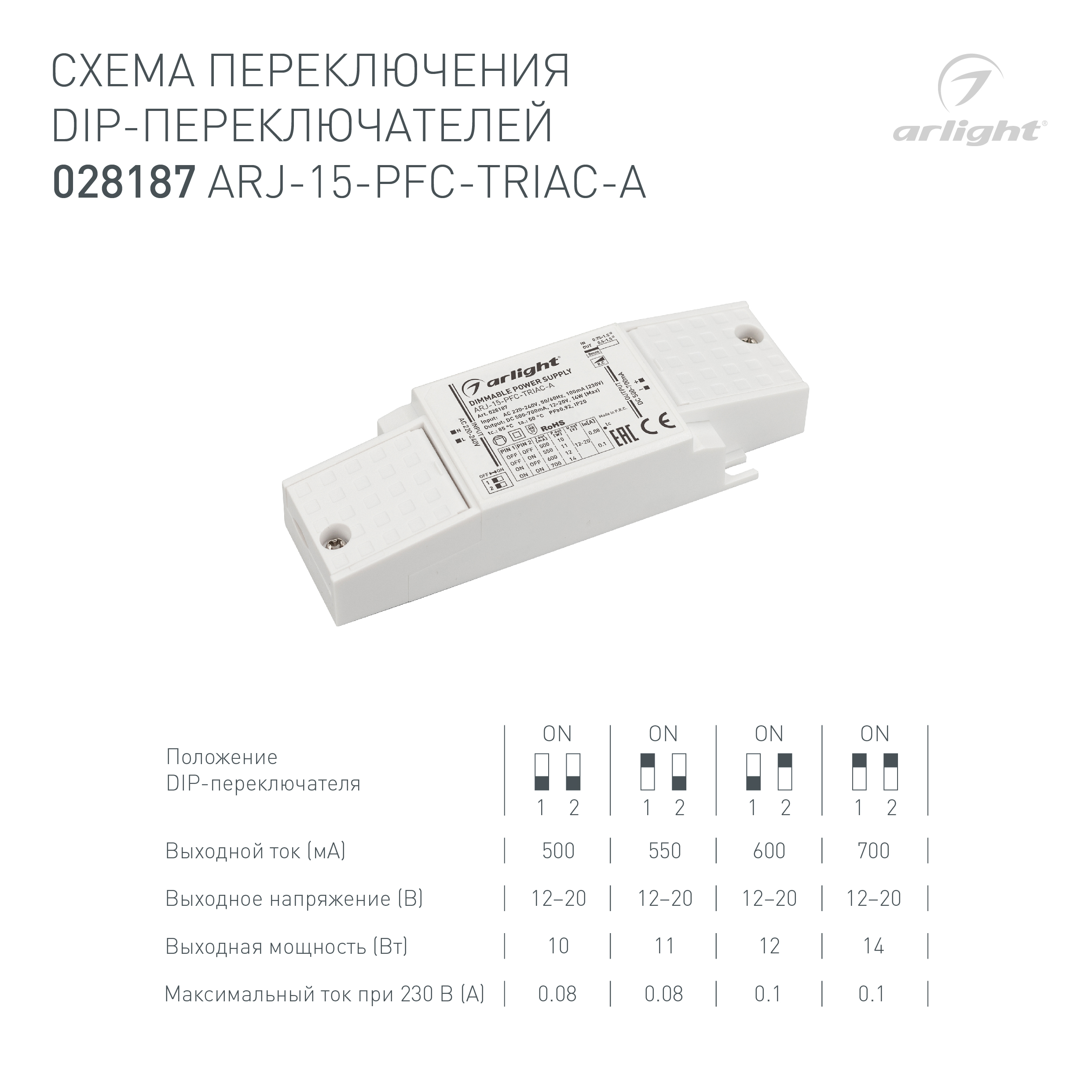 Характеристики - Блок питания ARJ-15-PFC-TRIAC-A (14W, 500-700mA) (Arlight, IP20 Пластик, 5 лет)
