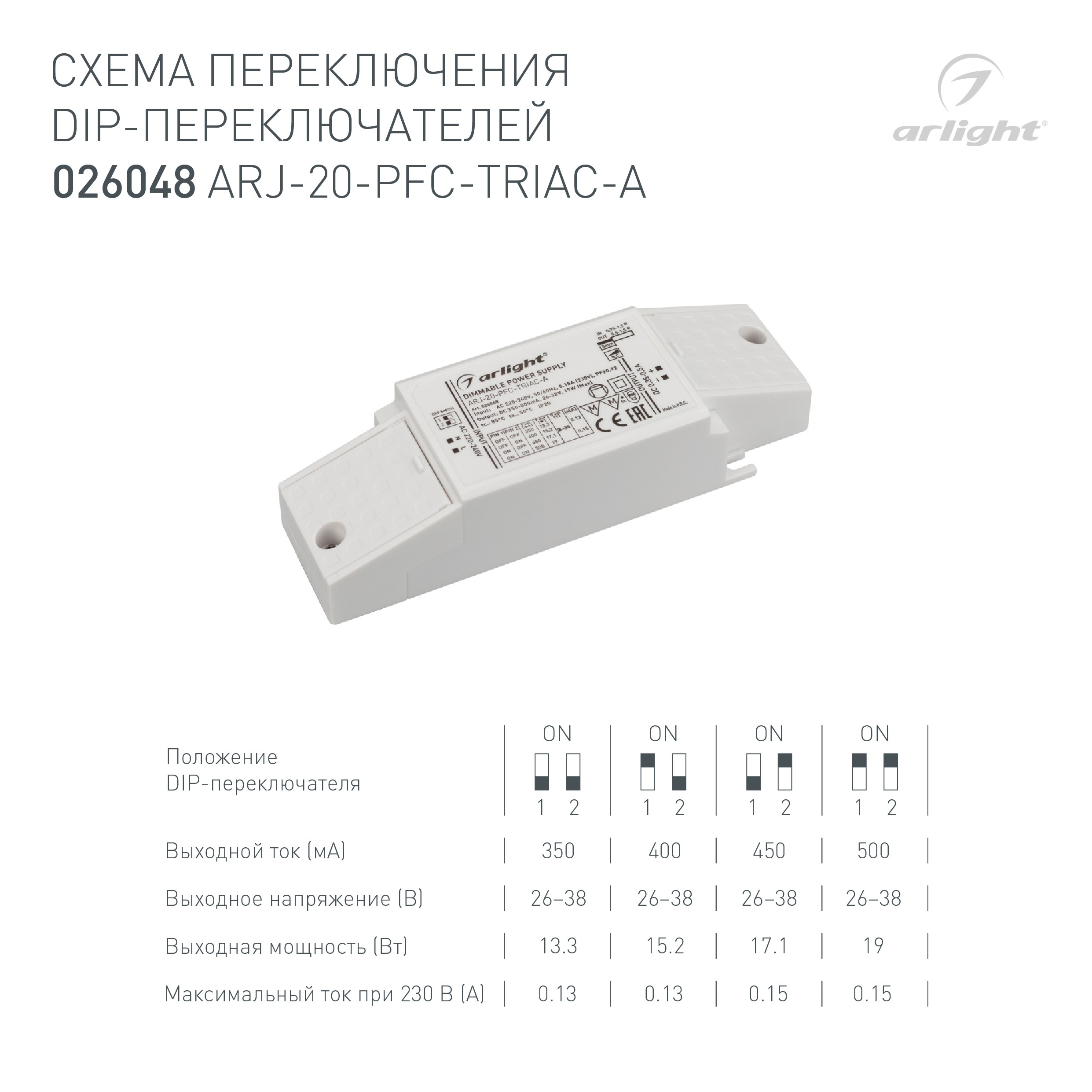 Характеристики - Блок питания ARJ-20-PFC-TRIAC-A (20W, 350-500mA) (Arlight, IP20 Пластик, 5 лет)