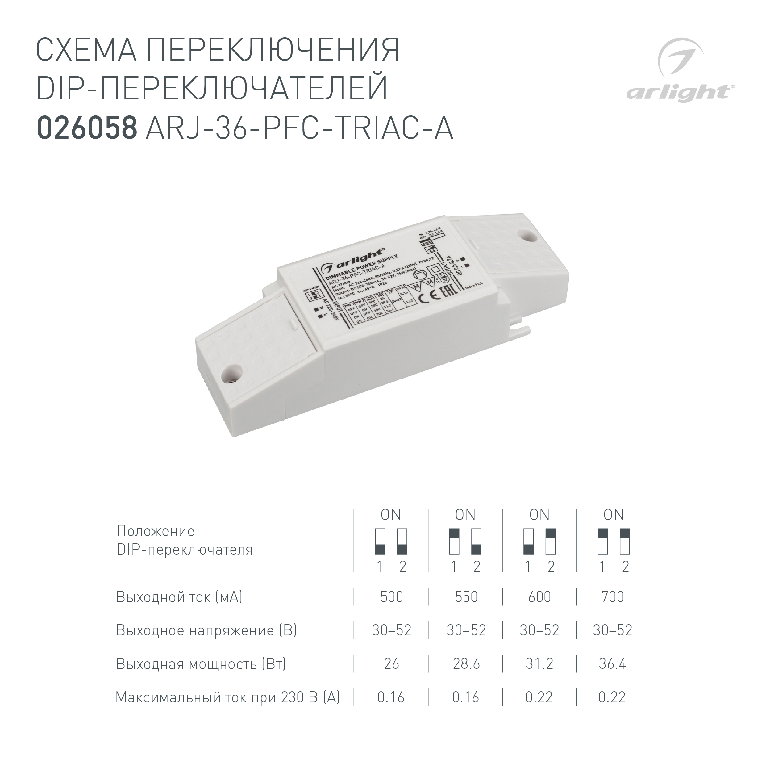 Характеристики - Блок питания ARJ-36-PFC-TRIAC-A (36W, 500-700mA) (Arlight, IP20 Пластик, 5 лет)