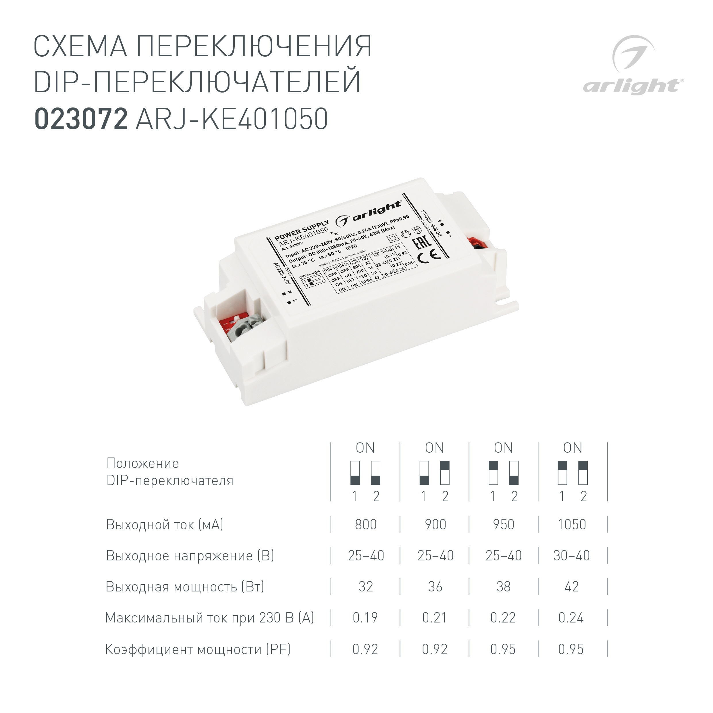 Характеристики - Блок питания ARJ-KE401050 (42W, 800-1050mA, PFC) (Arlight, IP20 Пластик, 5 лет)