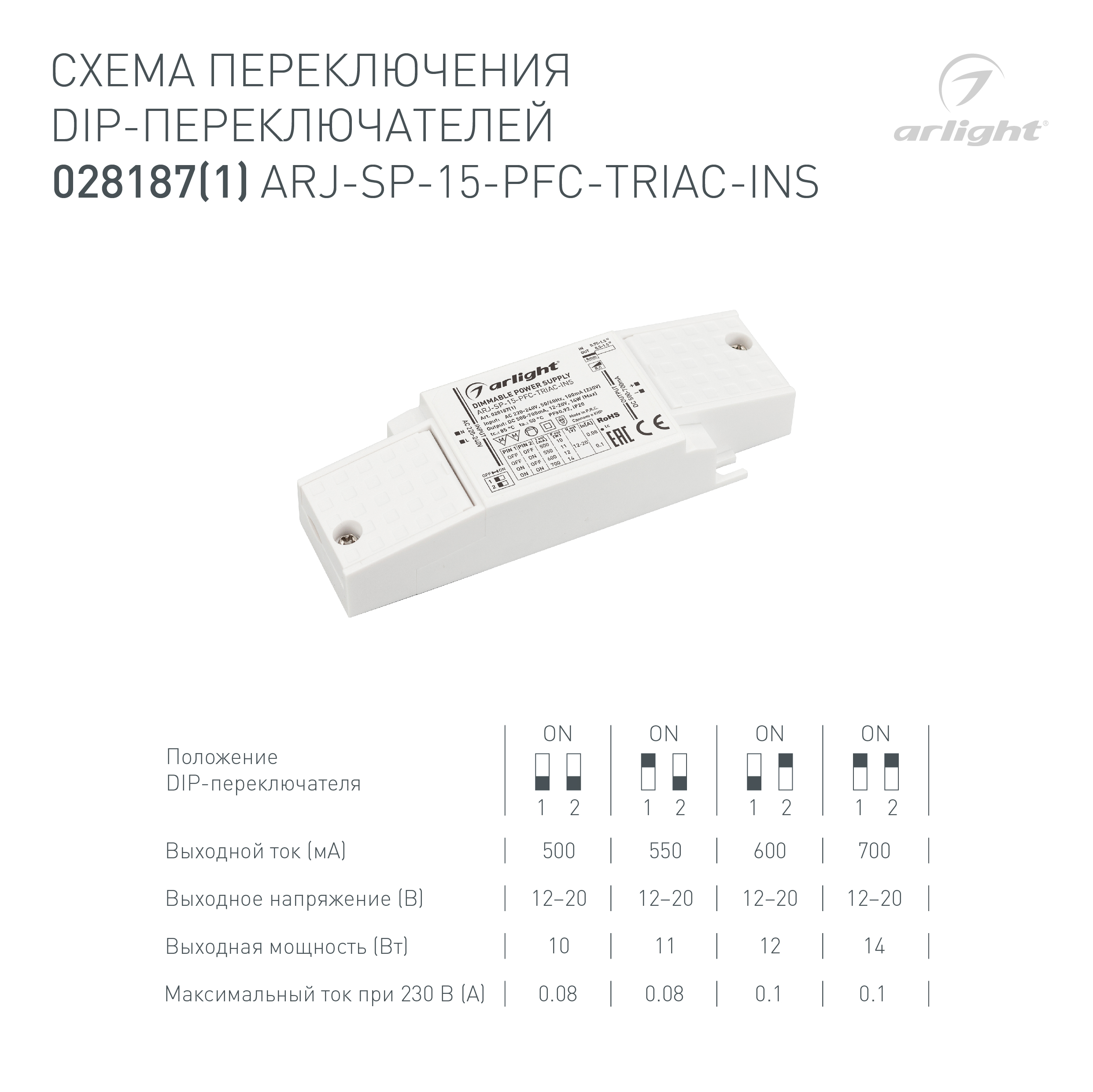 Характеристики - Блок питания ARJ-SP-15-PFC-TRIAC-INS (14W, 12-20V, 0.5-0.7A) (Arlight, IP20 Пластик, 5 лет)