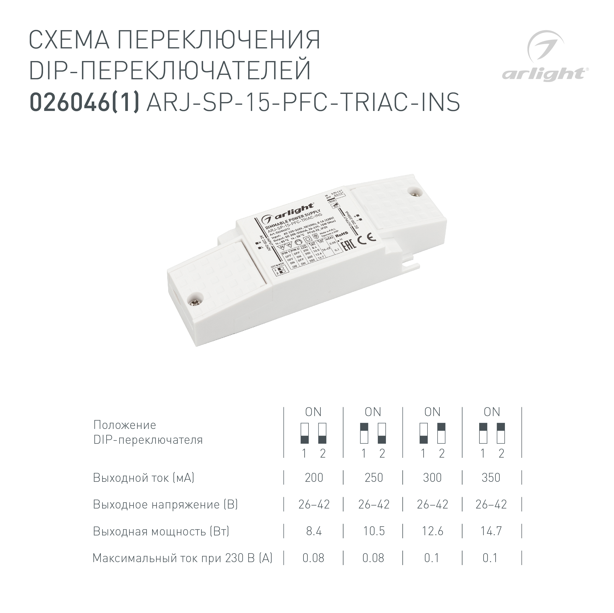 Характеристики - Блок питания ARJ-SP-15-PFC-TRIAC-INS (15W, 26-42V, 0.2-0.35A) (Arlight, IP20 Пластик, 5 лет)