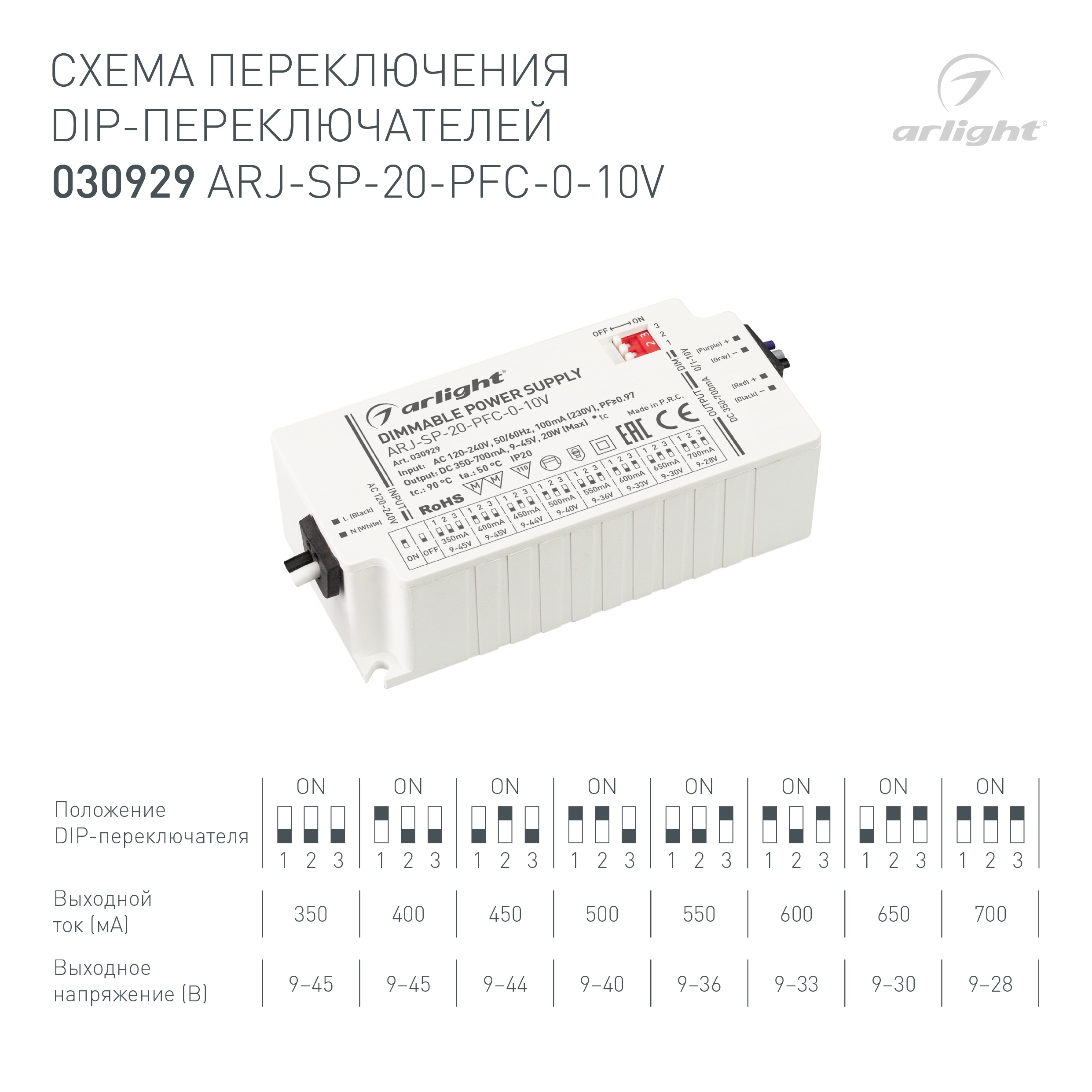 Характеристики - Блок питания ARJ-SP-20-PFC-0-10V (20W, 350-700mA) (Arlight, IP20 Пластик, 5 лет)