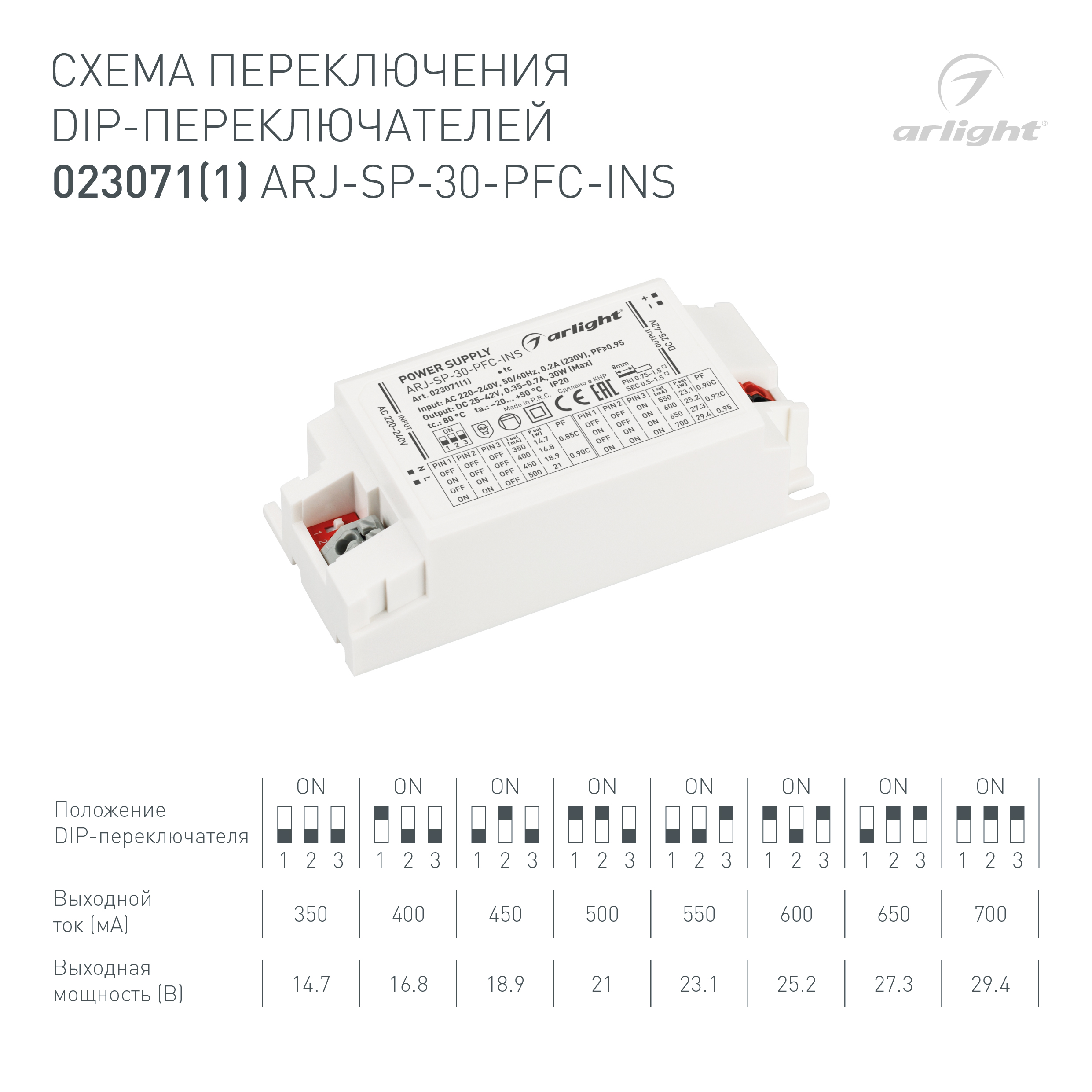 Характеристики - Блок питания ARJ-SP-30-PFC-INS (30W, 25-42V, 0.35-0.7A) (Arlight, IP20 Пластик, 5 лет)