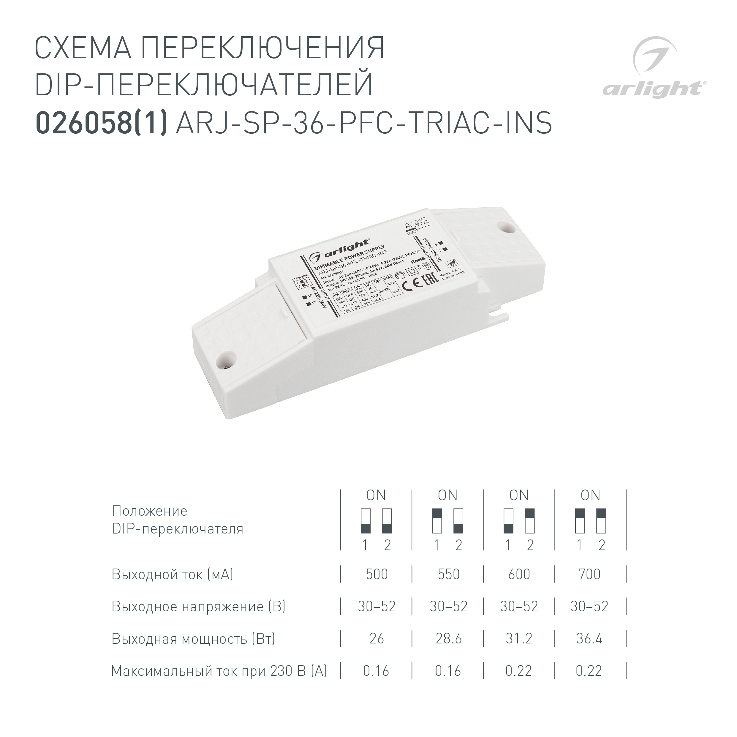 Характеристики - Блок питания ARJ-SP-36-PFC-TRIAC-INS (36W, 30-52V, 0.5-0.7A) (Arlight, IP20 Пластик, 5 лет)