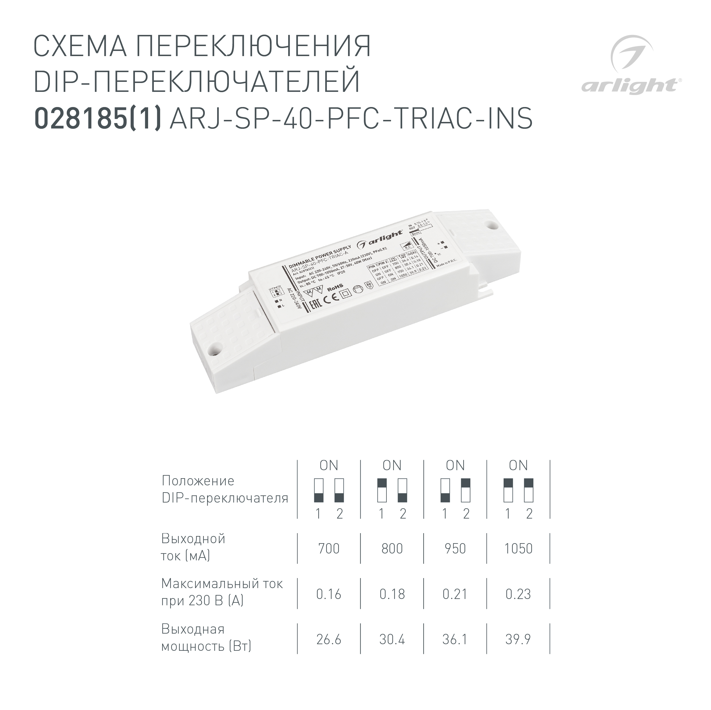 Характеристики - Блок питания ARJ-SP-40-PFC-TRIAC-INS (40W, 27-38V, 0.7-1.05A) (Arlight, IP20 Пластик, 5 лет)