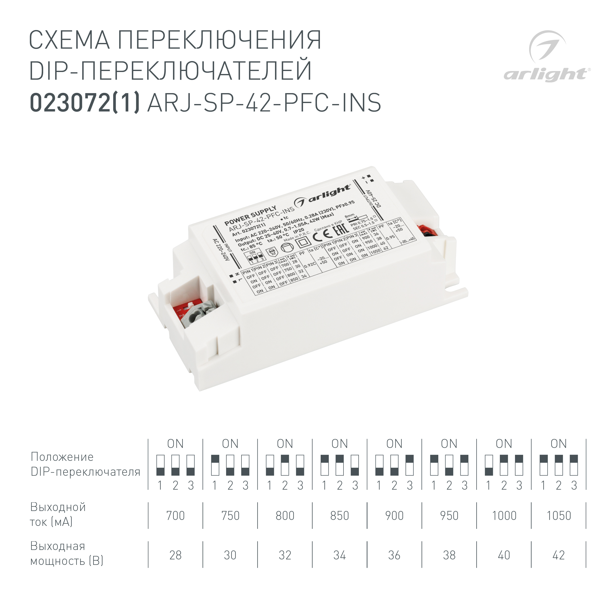 Характеристики - Блок питания ARJ-SP-42-PFC-INS (42W, 25-40V, 0.7-1.05A) (Arlight, IP20 Пластик, 5 лет)
