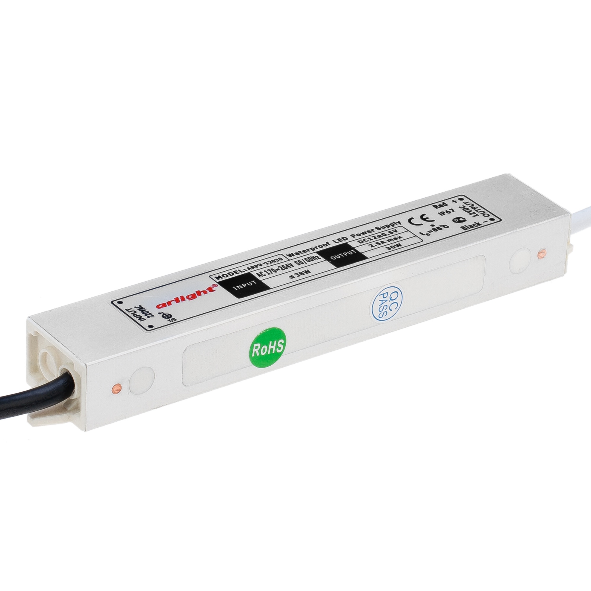 Блок питания 12V, ток 2.5А, 30Вт. Герметичный, для светодиодных изделий. Алюминиевый корпус. Габариты L180xW30xH20mm. Вход 170-264V AC, выход 12V DC +-0.5V. Вес 200 г. Гарантия 2 года