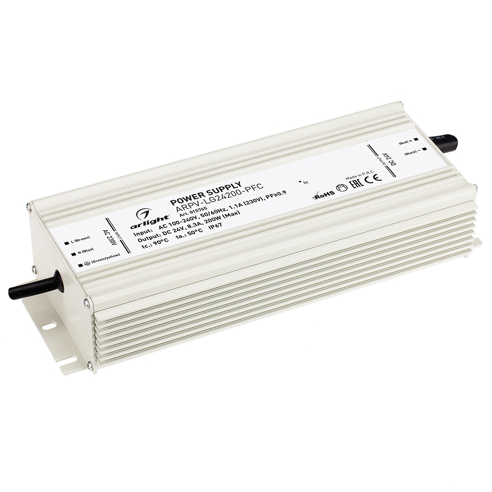 Характеристики - Блок питания ARPV-LG24200-PFC (24V, 8.3A, 200W) (Arlight, IP67 Металл, 5 лет)