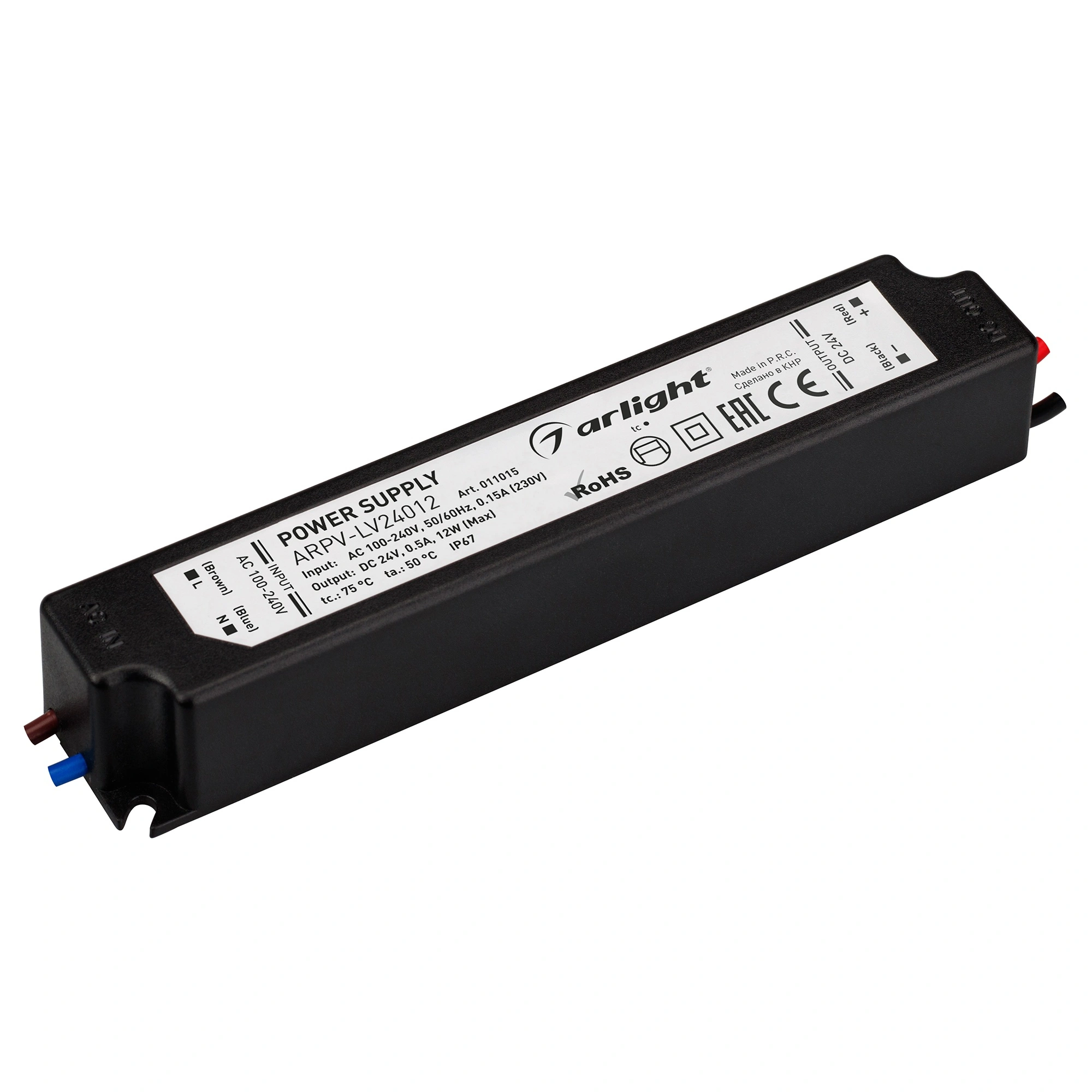 Источник напряжения с гальванической развязкой для светодиодных изделий. Входное напряжение 100-240 VAC. Выходные параметры: 24 В, 0,5 А, 12 Вт. Встроенный PFC >0,5. Герметичный пластиковый корпус IP 67. Рабочая температура -20…+50C⁰. Габаритные размеры длина 130 мм, ширина 25 мм, высота 21 мм. Гарантийный срок 2 года.