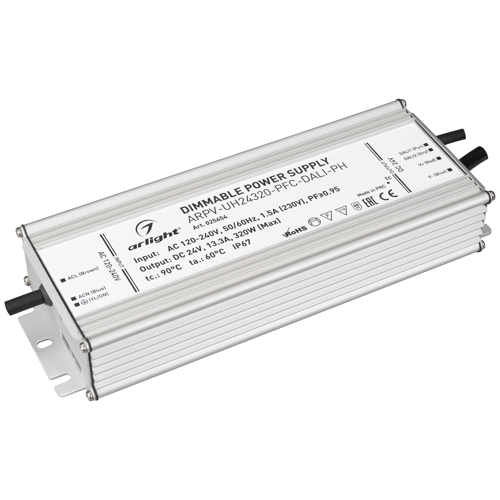 Блок питания для светодиодных лент с управлением DALI, с гальванической развязкой, с функцией PUSH DIM, корпус металл IP67, мощность 320 Вт; Входное напряжение 120-240V; Выход 24V 13.3A, PF>0,95; Совместимость со стандартом EMC. Размер 251x90x41,5 мм (224x90x41,5 мм - без "ушей"). Гарантия 7 лет. Замен-ся на 025654(1).