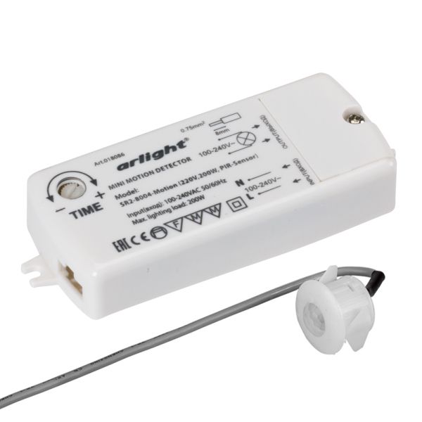 Датчик SR2-Motion (220V, 500W, PIR-Sensor) предназначен для бесконтактного включения и выключения ламп и др. источников света с напряжением 220В и мощностью до 500 Вт. Благодаря малым размерам 20х14 мм, датчик легко встраивается в любые конструкции (мебель, полки, стены и т.п.). Блок управление расположен отдельно от датчика и имеет размеры 90×40×18 мм, длина провода составляет 2м. Включение света происходит при улавливании движения в зоне чувствительности, а отключение через несколько минут после пропадания движения. Возможность регулировать время отключения от 10 сек до 3 мин и расстояние срабатывания от 0,5 до 2,5 м, позволяет подобрать оптимальный режим работы. Отличное решение при организации подсветки в гардеробных комнатах, коридорах, подсобных помещениях, совместим с мебельными светильниками Arlight. Продлевает срок службы источников света, снижая затраты на электроэнергию.