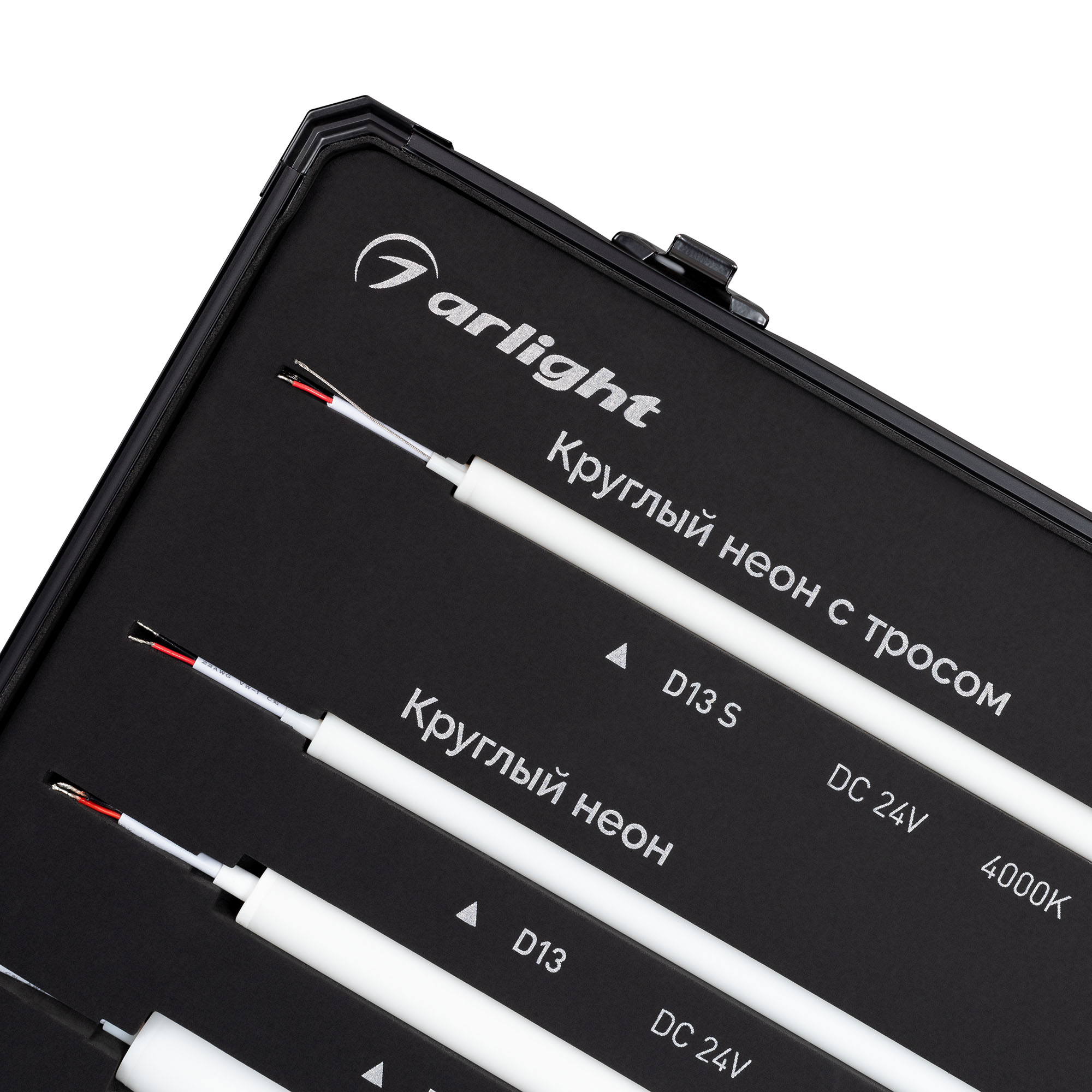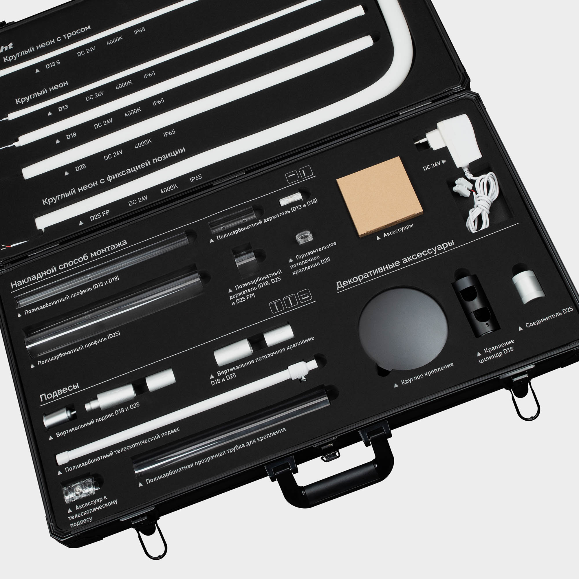 Демо-кейс для демонстрации различных вариаций круглого неона MOONLIGHT c возможностью подключения герметичных лент к сети. В комплекте демо-кейс, пять образцов неона (D13, D13 с тросом, D18, D25 и D25 с фиксацией позиции), блок питания на 230В, аксессуары для круглого неона. Материал: Металл, пластик, вспененный полиуретан. Размеры: 691×378×125 мм.