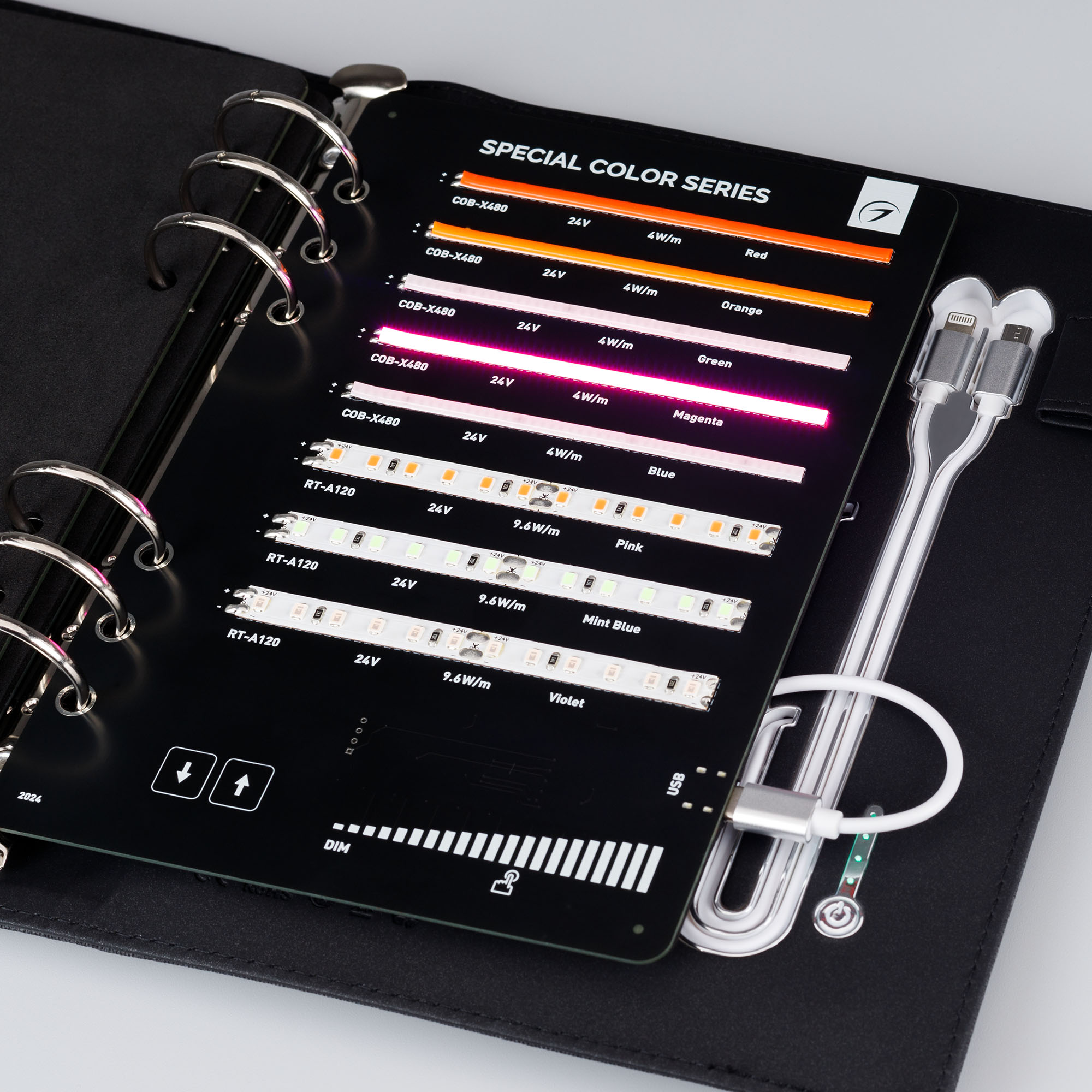 Демонстрационный набор светодиодных лент ARLIGHT. В кейс входят 45 образцов моделей лент COB, RT, MICROLED, MIX, SPI. Демо-кейс работает от Power Bank (8000 mAh). в комплекте 3 разъема для подключения и 1 разъем для зарядки.