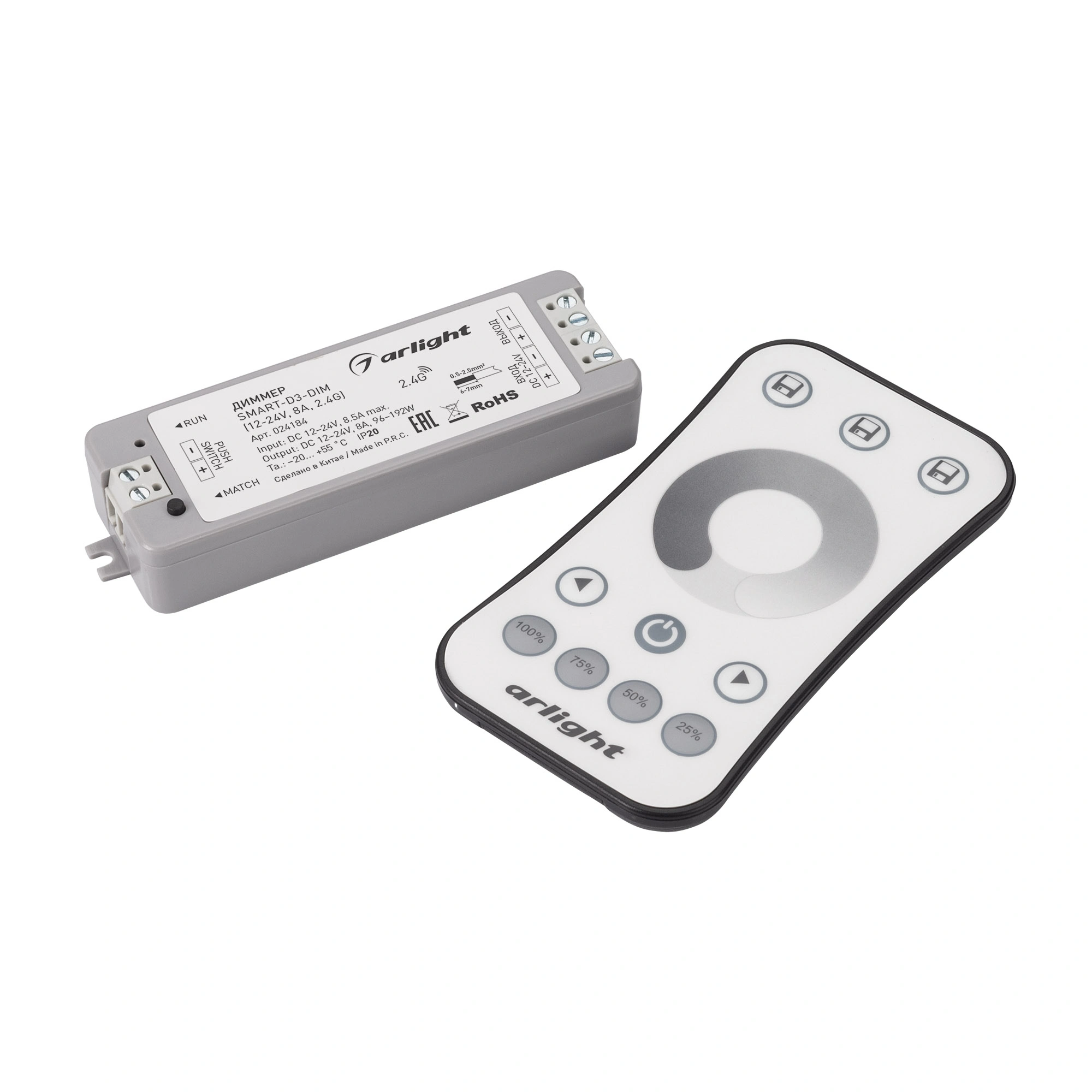 Характеристики - Диммер SMART-DIM-SET-RING (12-24V, 1x8A, ПДУ 2.4G) (Arlight, IP20 Пластик, 5 лет)