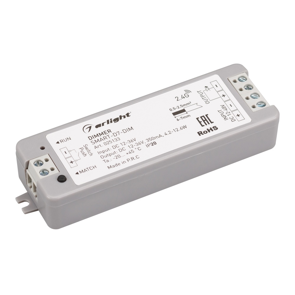 Характеристики - Диммер тока SMART-D7-DIM (12-36V, 1x350mA, 2.4G) (Arlight, IP20 Пластик, 5 лет)
